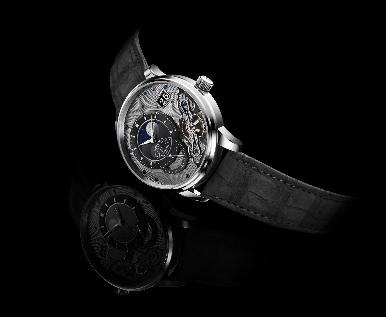 ムーブメントの一部が見える文字盤は、伝統的なグラスヒュッテ3/4プレートに、大径のムーンフェイズはディスクにアベンチュリンを用いて美しい星空を表現する。モダンとクラシックが絶妙に融合し、ブランドのオリジナリティがより際立つのだ。