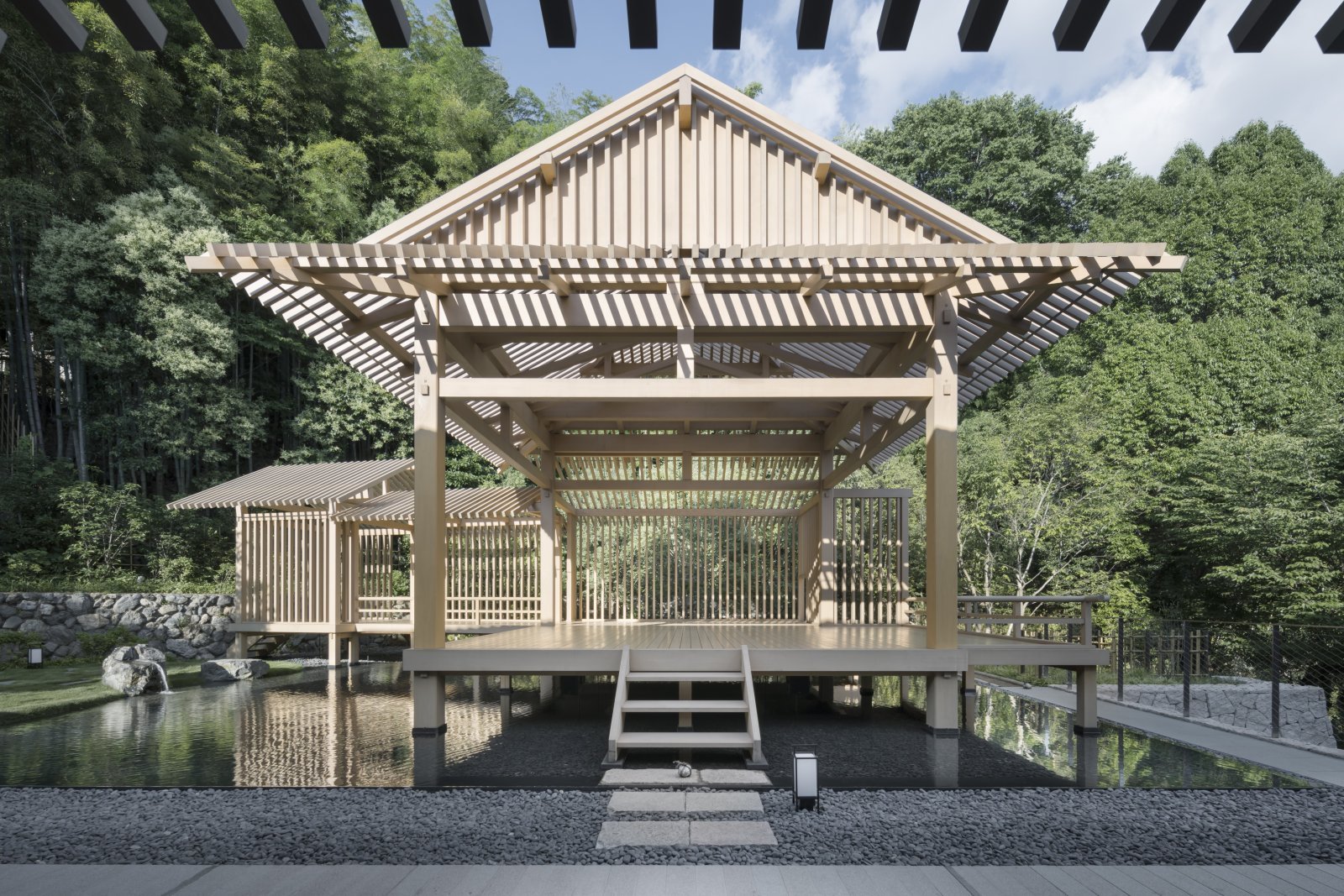 隈が手掛けた外観は、シンボリックな大庇(おおびさし)やルーバーが整然と並ぶ深い軒など、伝統的な木造建築の意匠を随所に取り入れたシックな佇まいが特徴。この建築とともに幽玄の世界を体感できるのが、市内のホテルとしては唯一備える能舞台だ。裏手に広がる緑豊かな竹林と溶け合うように、視線を通すルーバー状の部材のみで構成。舞台そのものが水盤の上に浮かぶ姿は、まさに神秘的だ。