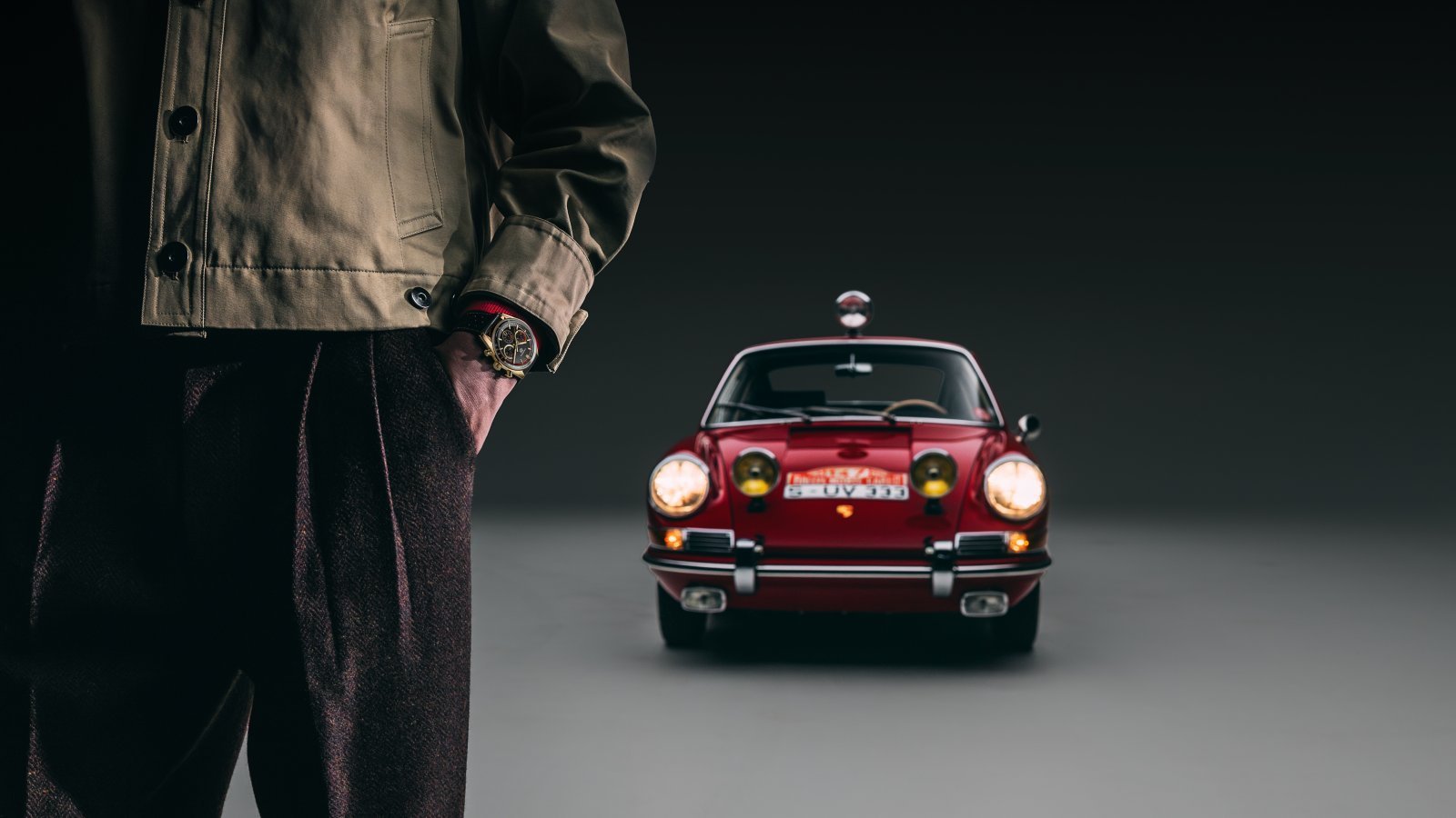 デザインは、1965年のレースに参戦したポルシェ911に搭載されたホイヤーのダッシュボードタイマーから着想を得たものだ。ブラックダイヤルは視界の悪いコンディションの中でのレースに欠かせない要素である視認性の高さを誇る。ベージュのマーキングはオリジナルの911のステアリングホイールを模したものだ。12時から4時のあたりまで記された赤いラインは、1965年のレースでポルシェ911が達成した時速0kmから100kmへの到達時間8.4秒に捧げるオマージュとなっている。