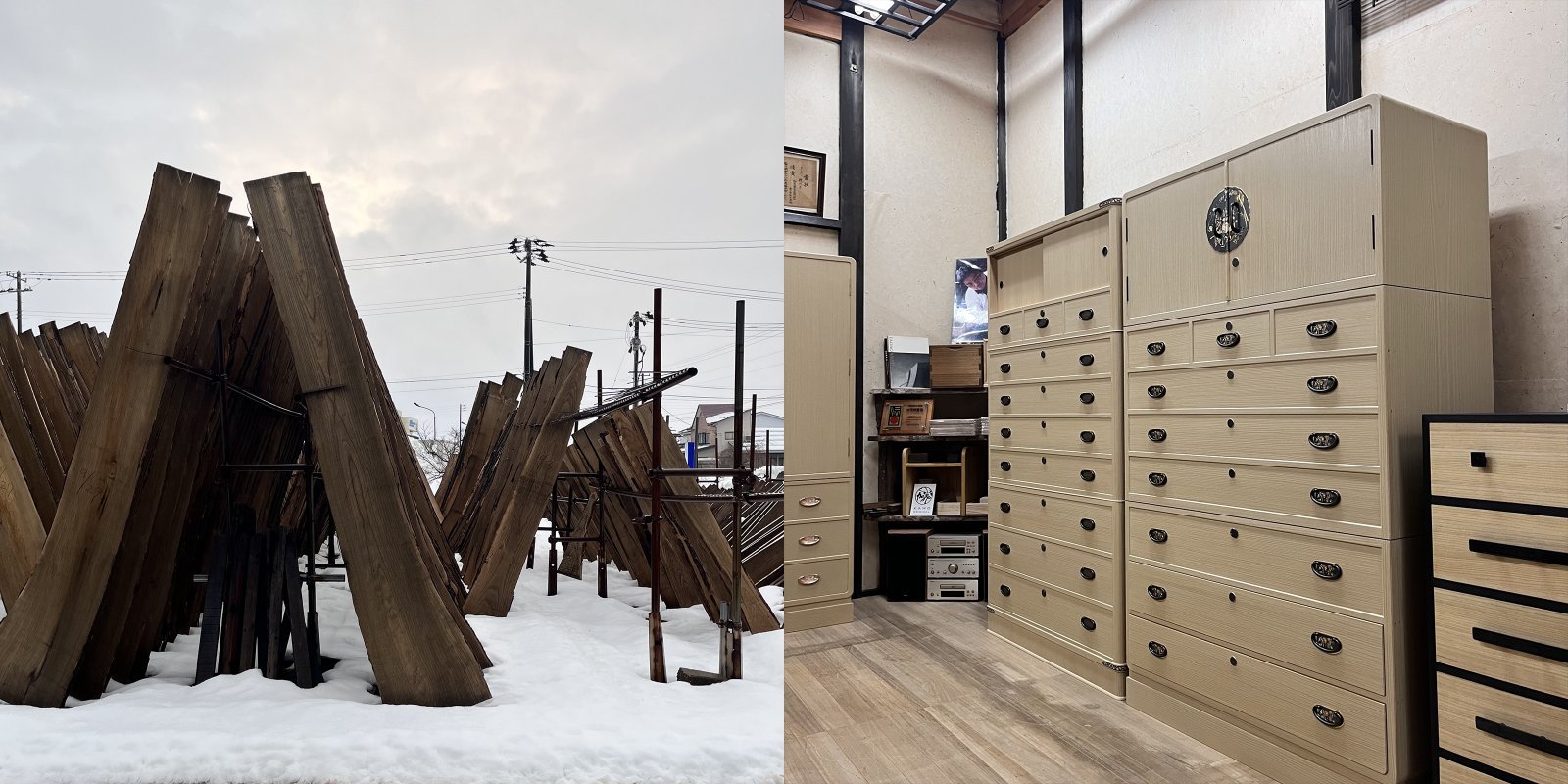 その後も燕と三条でいくつかの商談を終え、日暮れ前になんとか加茂に到着しました。加茂に限らずですが、桐箪笥の産地では屋外に桐材を干してある風景を目にします。雪の中に佇む桐材はとても風情があって、大切に丁寧に製作されていることが伺い知れます。それを見たさに、日没までに辿り着きたかったのです。