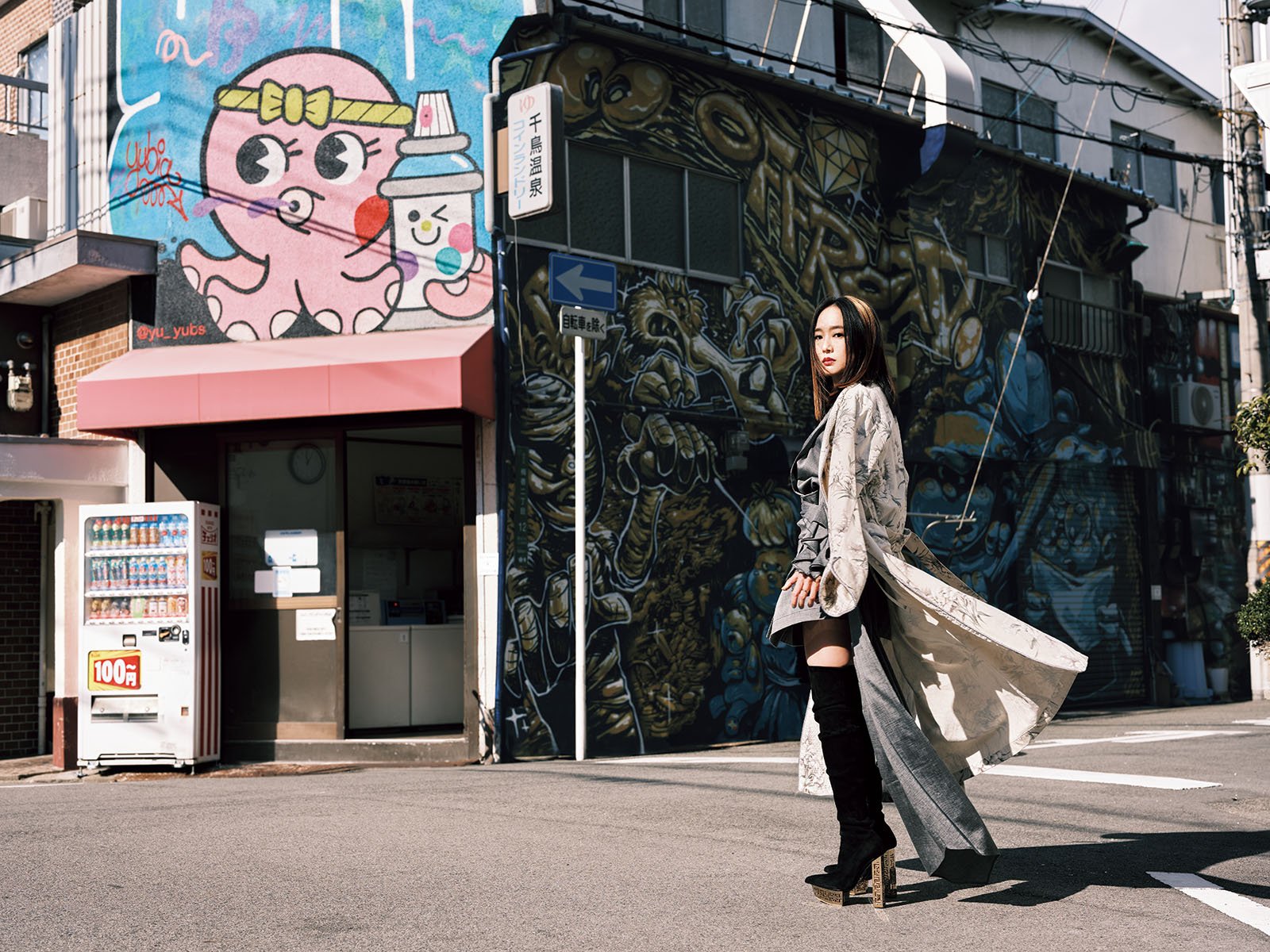 カートゥーンのアニメのカルチャーから影響を受けたイタリアのルゴシスによるミューラルは、工場跡地の錆びた壁を利用した作品。壁一面にダイナミックな構図で描かれたミューラルは、近くで見るとそのスケール感にただただ圧倒される。Instagram@lugosis ガウン¥208,000/エムエーデザビエ(エムエーデザビエinfo@ma -deshabille.com)、ドレス¥75,900/トーガ プルラ、ベルト¥35,200/トーガ トゥ(ともにトーガ原宿店 TEL:03-6419-8136) その他私物