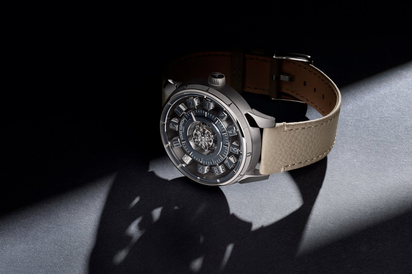 新作モデルのケースは、従来のフォルムのアウトラインを尊重しつつ、ケースバックへと続く断面に変曲点を組み入れた新デザインを採用している。そして自社で培ってきた技術を惜しみなくこのケースの製作に注ぎ込んでいる姿勢がよく見て取れる。ミドルケース側面にはサテン艶消し加工が施された一方で、ベゼルにはサンドブラスト加工を施した溝内にポリッシュ仕上げのレリーフ文字で「LOUIS VUITTON」を綴る。単なる表面加工ではなく、意味作用を込めた立体的な造形の特別なケースには、日本の祭礼で使用される“和太鼓”にちなんだネーミングがなされた。