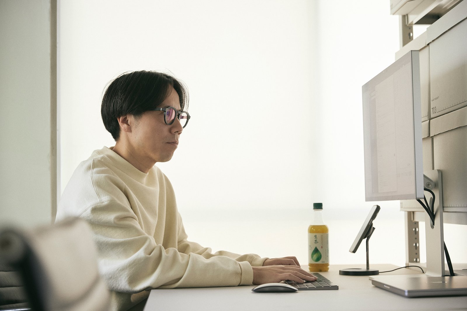 2024年に村上がリニューアルデザインを担当した「生茶」は異例の大ヒットを記録。”現代におけるお茶の在り方”というコンセプトにまで遡ってデザインを考案した。「従来のパッケージデザインは店頭では目立つけれど、生活の場では主張が強すぎて馴染みにくい印象でした。そこで商品名を小さくして背景を緑茶の緑ではなくあえて白にすることで、日常に馴染み、お茶そのものの色やシンボルの雫の緑が際立つようにしました。525mlボトルはガラス瓶を模したフォルムでMacBookと一緒にリュックサックに入れても違和感のないようなデザインとなっています」