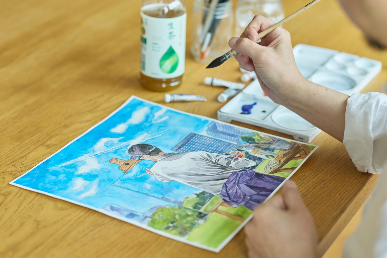 普段イラストを描いている時間を思い浮かべながら作品に落とし込んでいったという黒木。「ずっと描き続けていると没頭し過ぎて客観的に絵を見ることができなくなってしまうので、頭をクリアにする瞬間が必要なんです。空を見上げながらお茶を飲むことで、脳がリセットされる。一連の作業を止めることなくちょっと一息つく、という感覚ですね。お茶は日本人が慣れ親しんできた飲み物なので、ほっとできるイメージもある。絵を描く合間に気持ちを落ち着かせ、また作業に戻るためにはペットボトルのお茶は最適な飲み物ではないでしょうか」