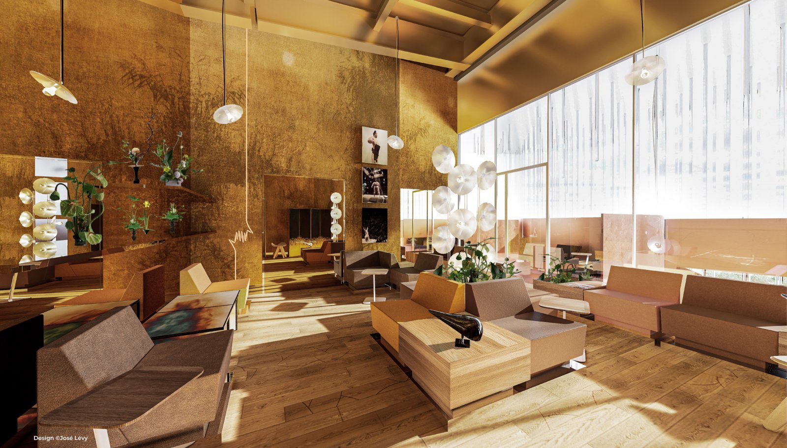大阪・関西万博2025 フランス館のプロトコールラウンジの完成予想図。左にジョゼ・レヴィの「ムービング・タタミ」ベンチ、右にピエール・ポランの「アンディ」チェア。パートナーラウンジでは、フランスの遺産とのつながりがさらに強調される。このフランス館の中心的なエリアでは、ステラ・カデンテによる幻想的な壁画が壁一面を黄金に輝かせている。この洗練された空間に、ジョゼ・レヴィは大阪・関西万博2025のために特別に制作した家具を配置した。彼は、モビリエ・ナシオナルに保存されていた設計図をもとに、フランスの著名なインテリアデザイナーであり、パリの地下鉄駅のアイコニックな座席を手がけたジョゼフ=アンドレ・モットの未発表デザインを現代に甦らせた。