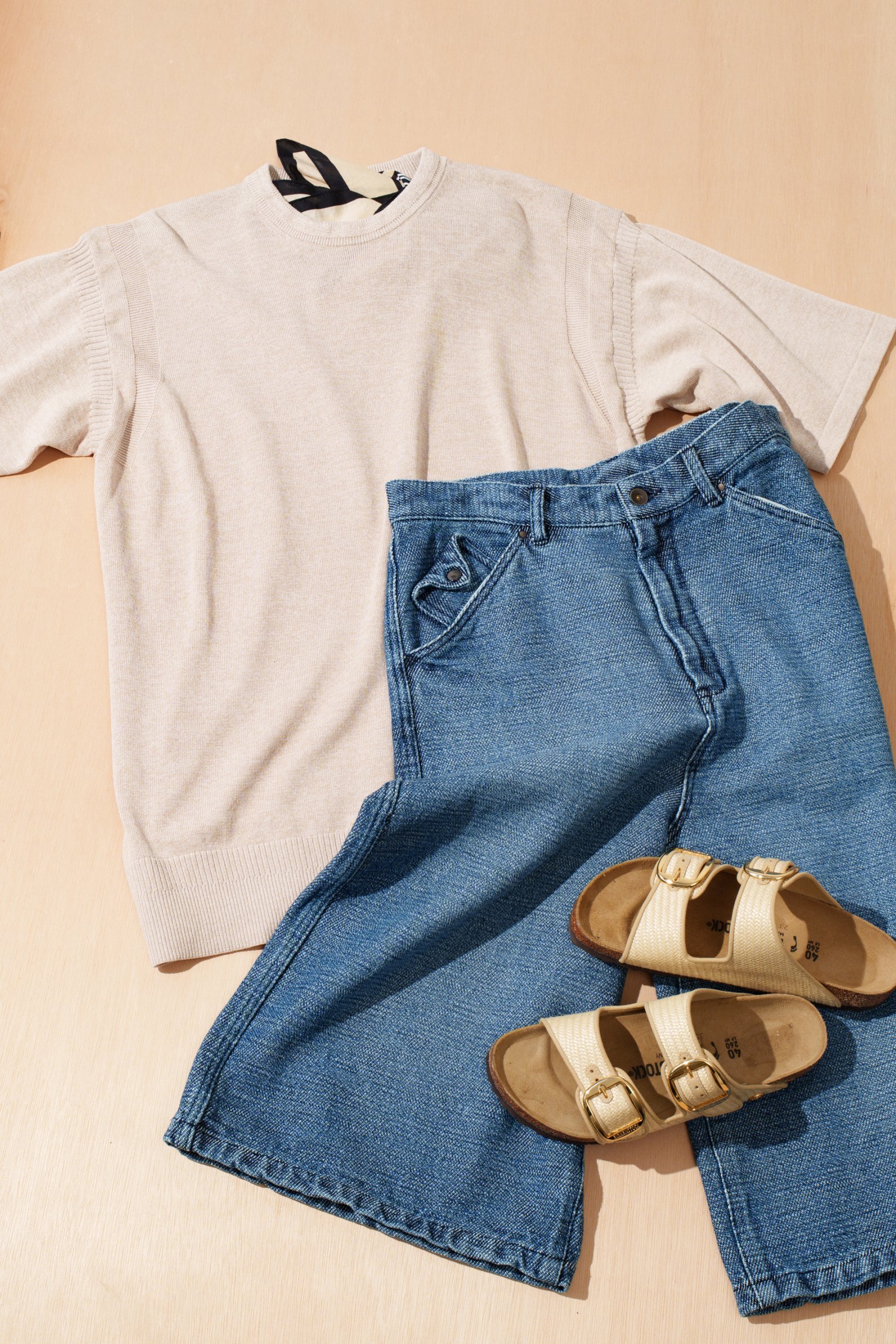 暑い夏を乗り切る快適なデイリーコーデ。定番のTシャツ+短パン姿をブラッシュアップさせたイメージだ。デニムは7分丈のワイドで、膝を隠せて日常的に穿きやすいデザイン。太い糸の独特な織りによるクラフト感溢れる生地が使われている。トップスは肌に馴染むスキントーンのニット。和紙にシルクを混ぜた編みでシャリ感があり、汗でベタつきにくく爽やかだ。