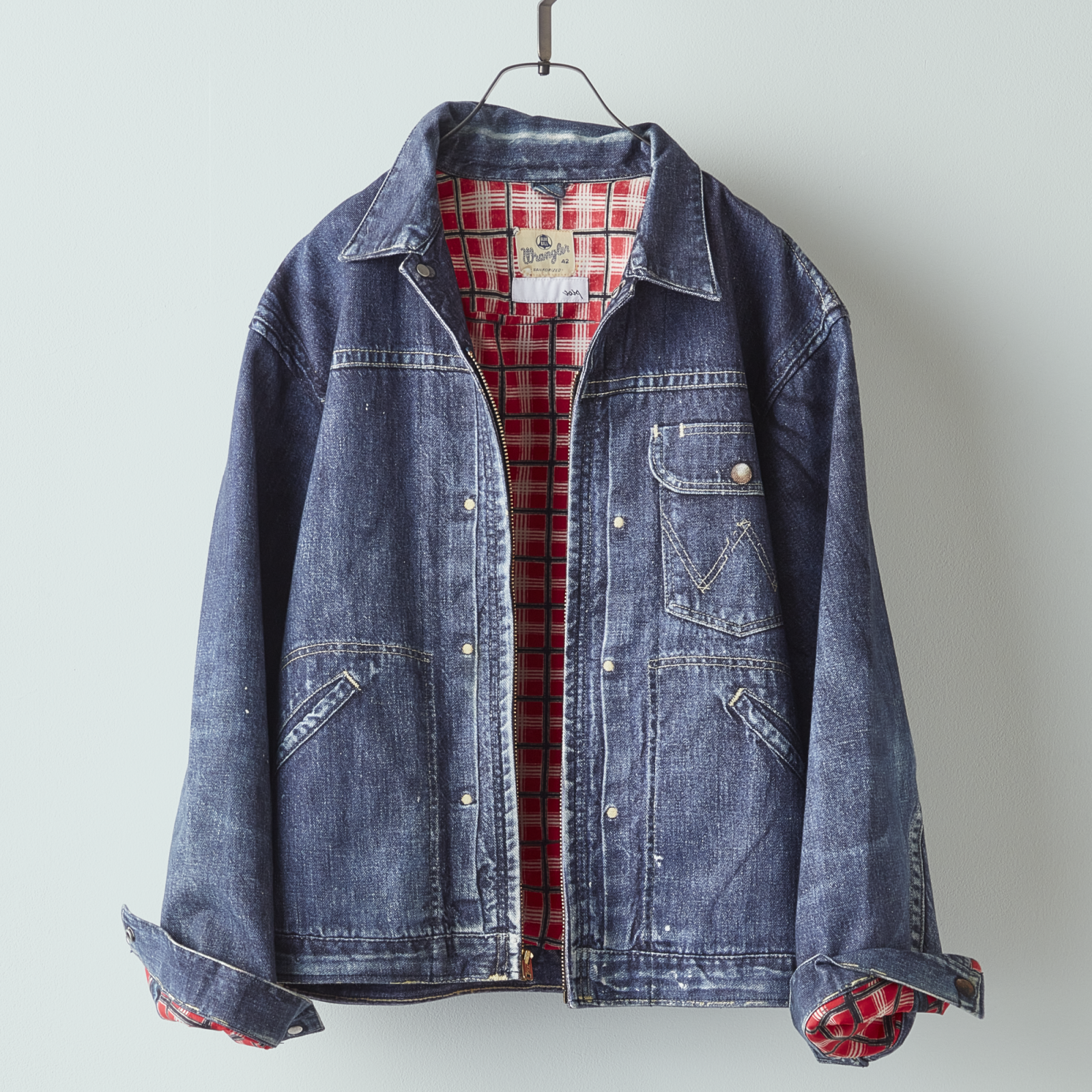 その翌年の48年に早くもデニムジャケットが発表されるが、その品番が「11MJ」。「MJ」はメンズジャケットの略称で、これをベースに、50年頃には「111MJ」がつくられ、50年代末にはデニムジャケットに初めてジッパーを採用した「11MJZ」へと進化する。これらのデニムジャケットは、肩の可動域を確保したアクションプリーツ、フロントのプリーツを留める「丸カン」と呼ばれる円形状の縫い糸など、それまでのデニムジャケットには見られないディテールを備えていた。前述の本では「よくもまあ、ワークウエアでここまでやったな、と感心させられてしまう」と著者の出石も驚く。テーラーならではのデザインで、その後のラングラーのデニムジャケットを象徴するデザインとなった。