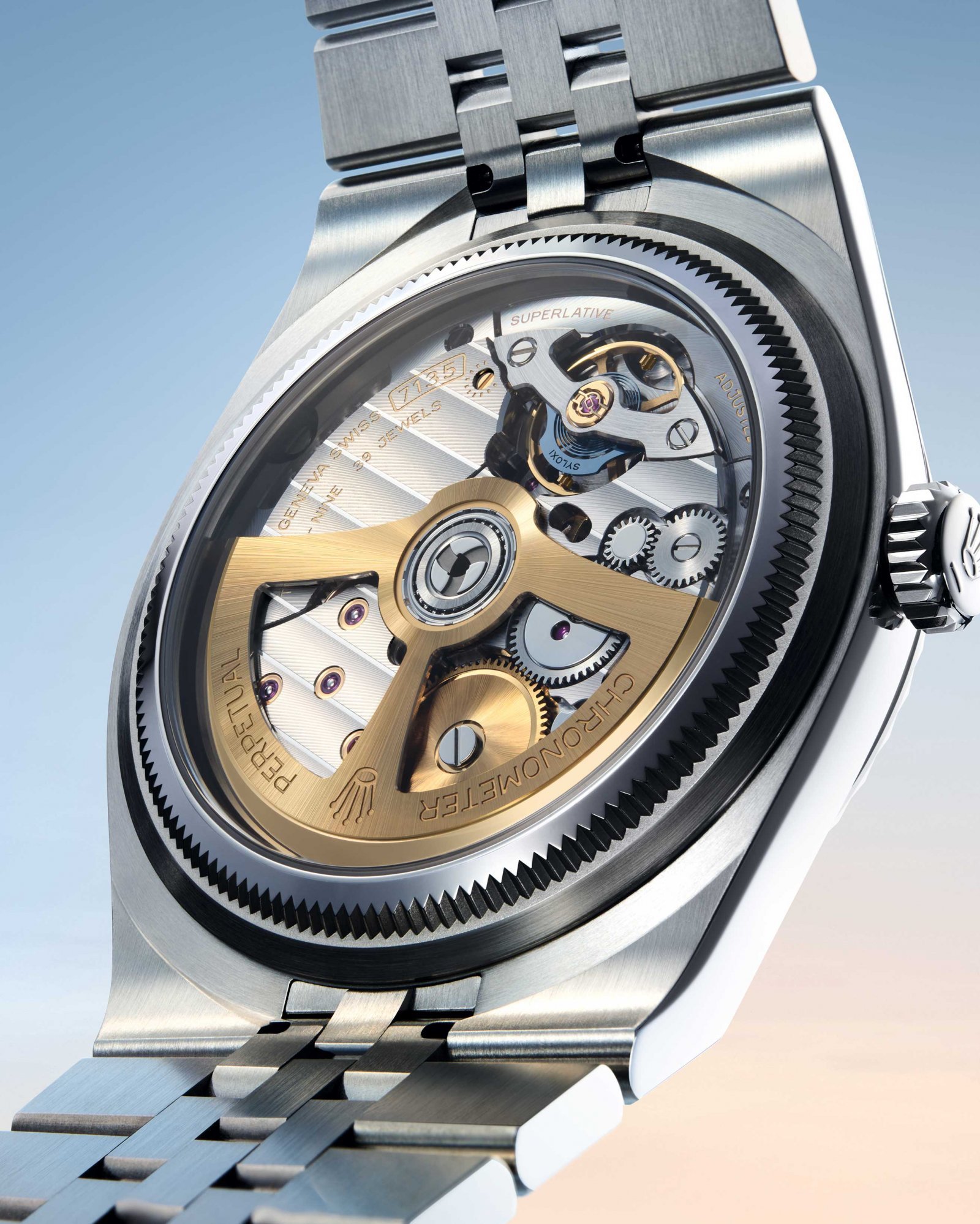 ムーブメントは新開発の「キャリバー7135」を搭載。毎時36,000回の振動数を誇り、ケースバックからのぞける、ムーブメントに施されたロレックス コート・ド・ジュネーブ装飾が美しい。