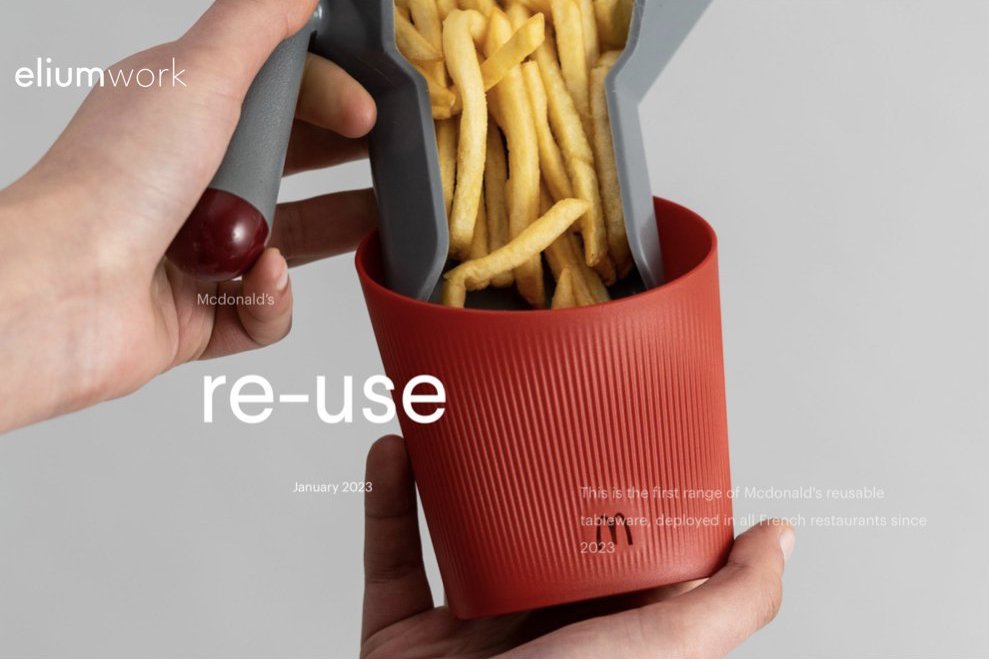 まず驚かされたのは、2023年1月からフランス全土のファーストフード店で導入が始まった、リユース可能なテーブルウエアのデザインです。これまで親しんできた紙のパッケージのイメージを残しながらも、違和感のないルックスに仕上がっていて、むしろ愛着が湧くような佇まいでした。マクドナルドだけでなく、クイックやバーガーキング、KFCなども同時に使用を始めていますが、その中でもマクドナルドの新しいテーブルウエアは、導入前から注目を集めていました。