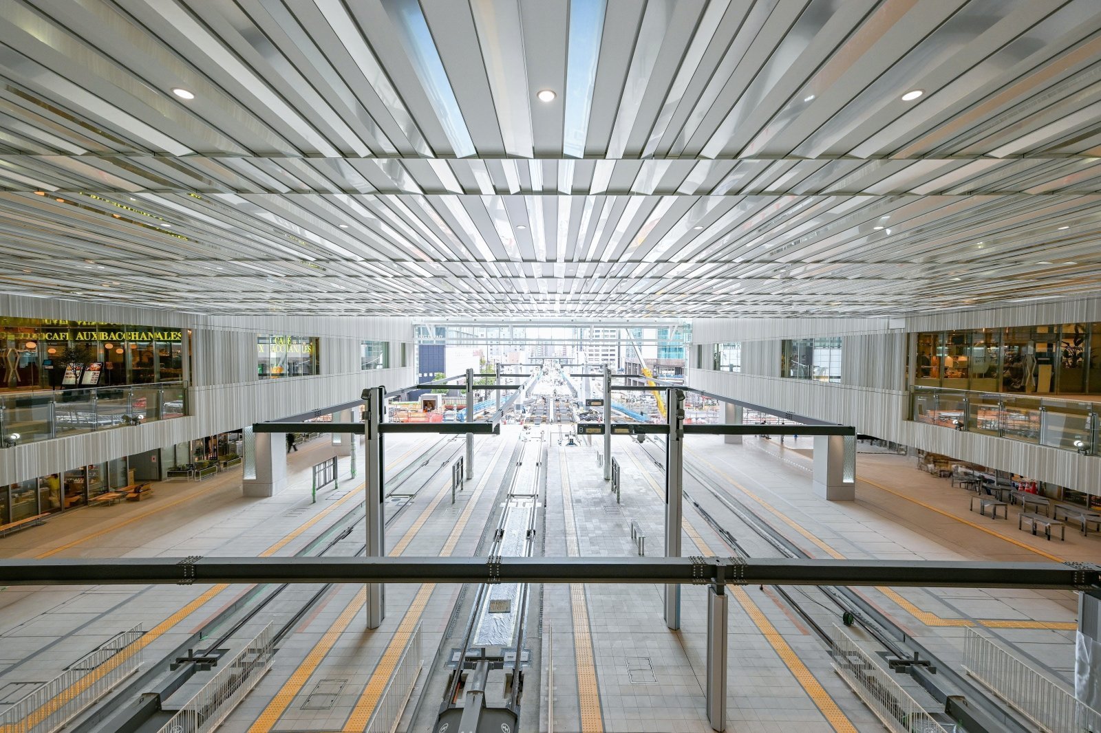 路面電車の乗り入れは8月からスタート予定。地上20階建てのビル中央を貫く4層吹き抜けのアトリウム空間は、ガラス張りのファサード越しに自然光が降り注ぐ。アルミパネルを用いた曲面壁やリズミカルな天井に光がランダムに反射し、発着する路面電車と人々が交錯する風景が水面のように映り込むだろう。階段状になった親水空間「雁木」をモチーフにした、3階の「雁木テラス」からホームを見下ろしながら、移ろいゆく情景を川辺に佇むように楽しめる。