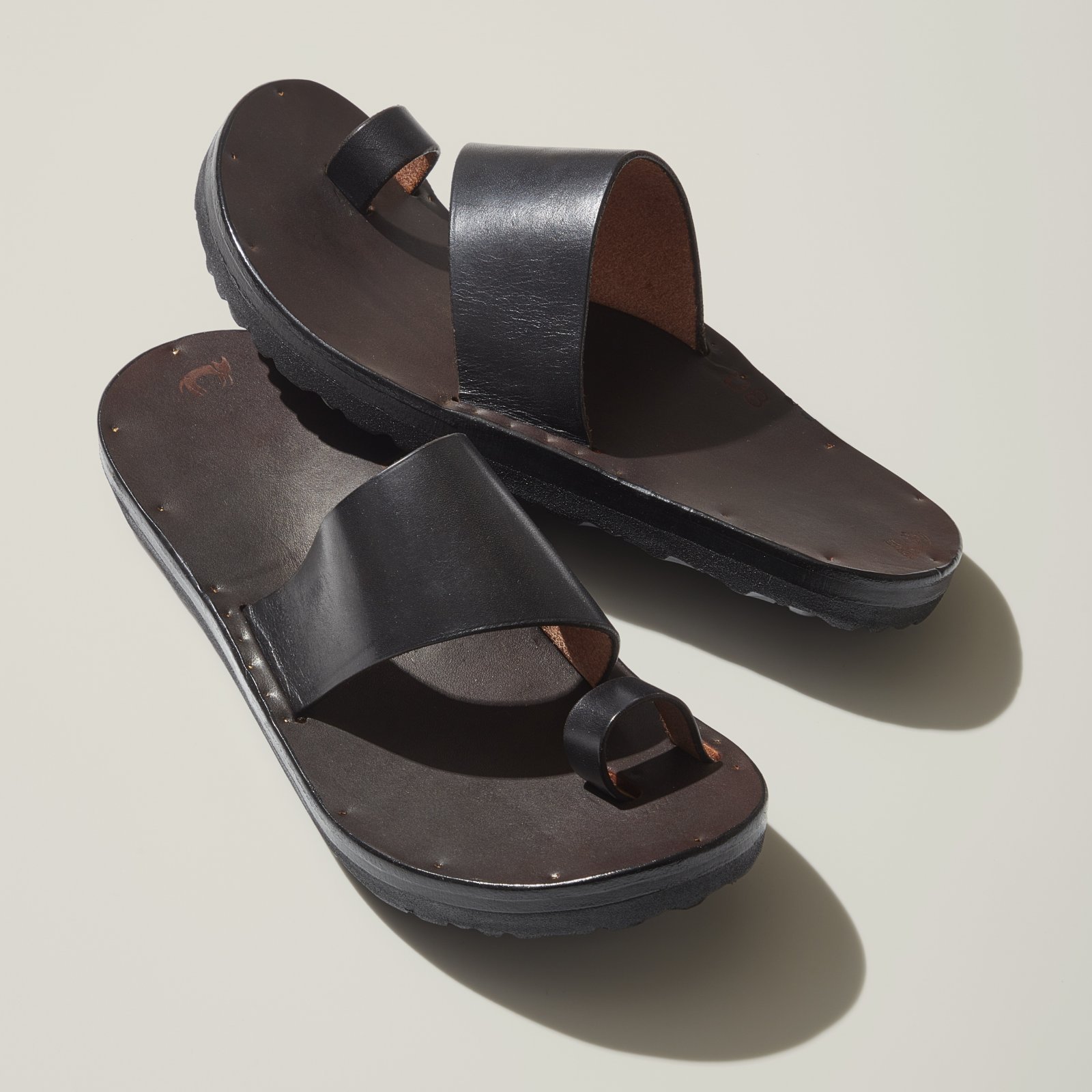 今回取り上げた「アリス」はトゥリングタイプのデザインで、ブランドを代表するモデルだ。親指部分が独立した「サムホール」が特徴的で、甲部分を覆うストラップもよく見ると斜めにカットされている。親指をホールドしてくれるので、この種の一般的なサンダルよりもフィット感もある。もちろん素材は「ラティゴレザー」で、履けば履くほどに色艶を増す。独特な盛り上がった土踏まずも、時間をかけて足に馴染み、やがて長時間歩いても疲れにくい存在へと変わっていく。アウトソールには耐久性を備え、簡単に滑らない底材が使われており、実用面でも妥協のないつくりだ。
