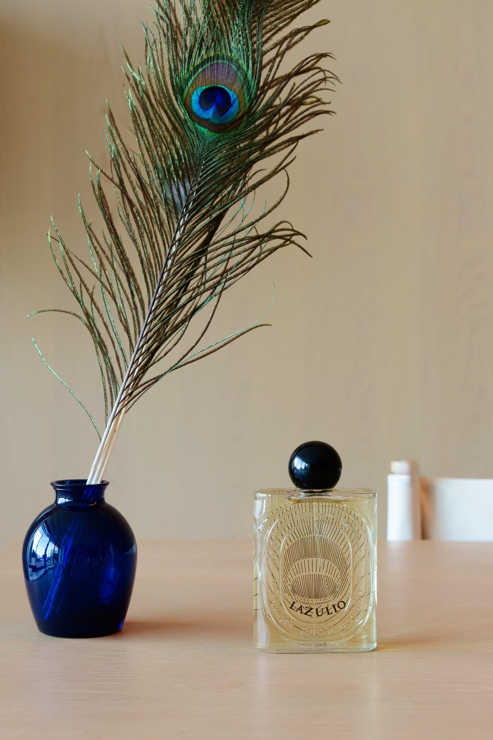 「まず最初にディプティックからクジャクのテーマが提示されました。そこからイメージを膨らませることになりました。羽の複雑な色の混ざり具合をどのようにオー ド パルファンにするかを調香の課題に。クジャクの羽は息を飲むような美しさがあります。そしてよく見ると異なる色の輪が連なっています。このコントラストを香りで表現したのがラズリオです」