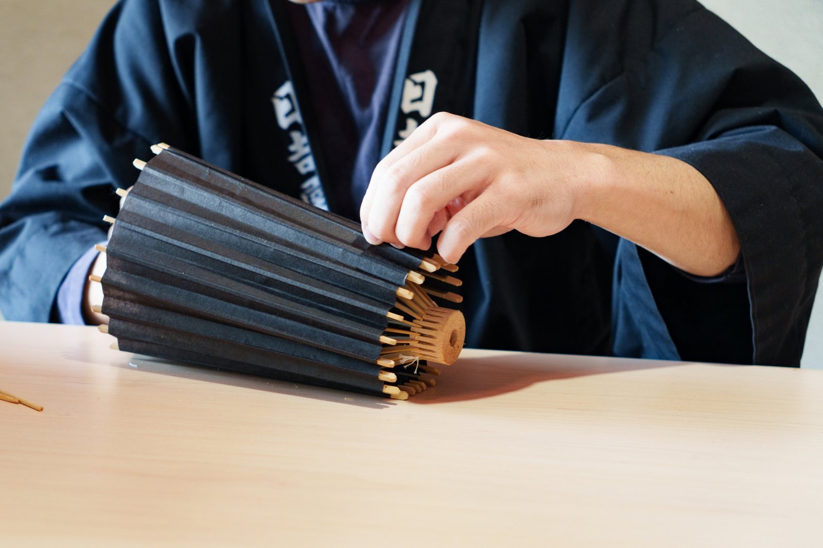 きゅっと束ねて広げることを繰り返す和傘の制作は、筒状の竹を正しい順番で組み上げる必要があるそう。