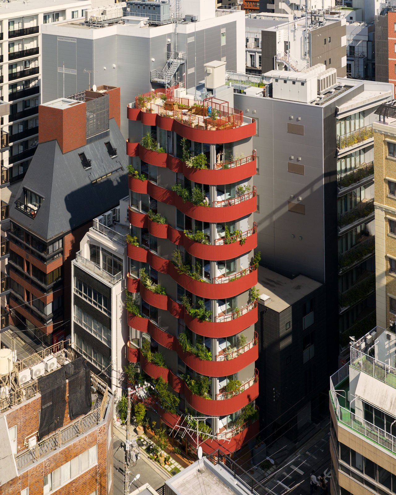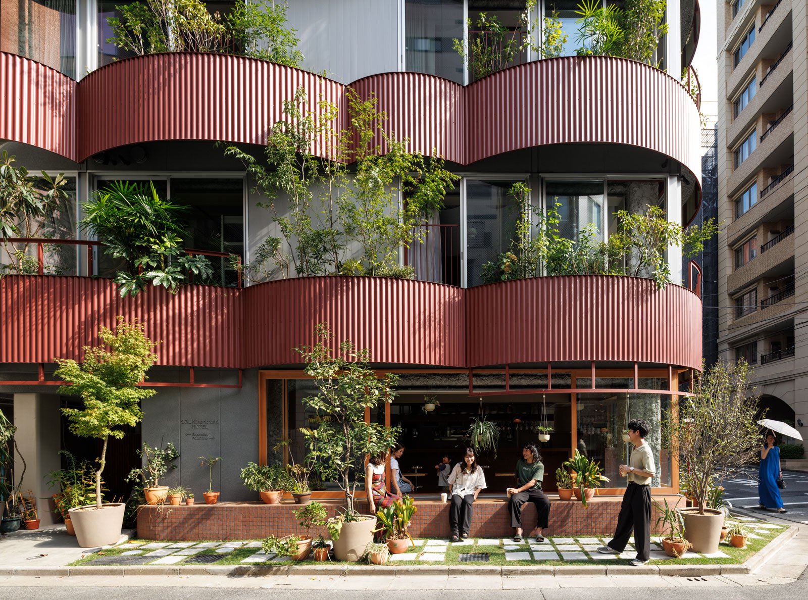 外装を中心に設計を主導したのは、〝自然と建築〟をテーマに活動する武田清明。住民同士が鉢植えを持ち寄り、株分けをしながら植物を育てる昔ながらの〝路地裏園芸〟にヒントを得て設計した。「人形町の園芸カルチャーを纏わせながら建物を積層し、地域とのつながりが感じられるこの町らしい風景を表現しました」と武田は語る。外壁を緩やかに湾曲させて、その隙間に近隣から株分けされた約100種類の植物を中心に植栽を構成した。内外に用いられたレンガや外壁の赤茶の金属板とともに、多様な緑が季節ごとに表情を変えながら、通りにやわらかな彩りをもたらしている。