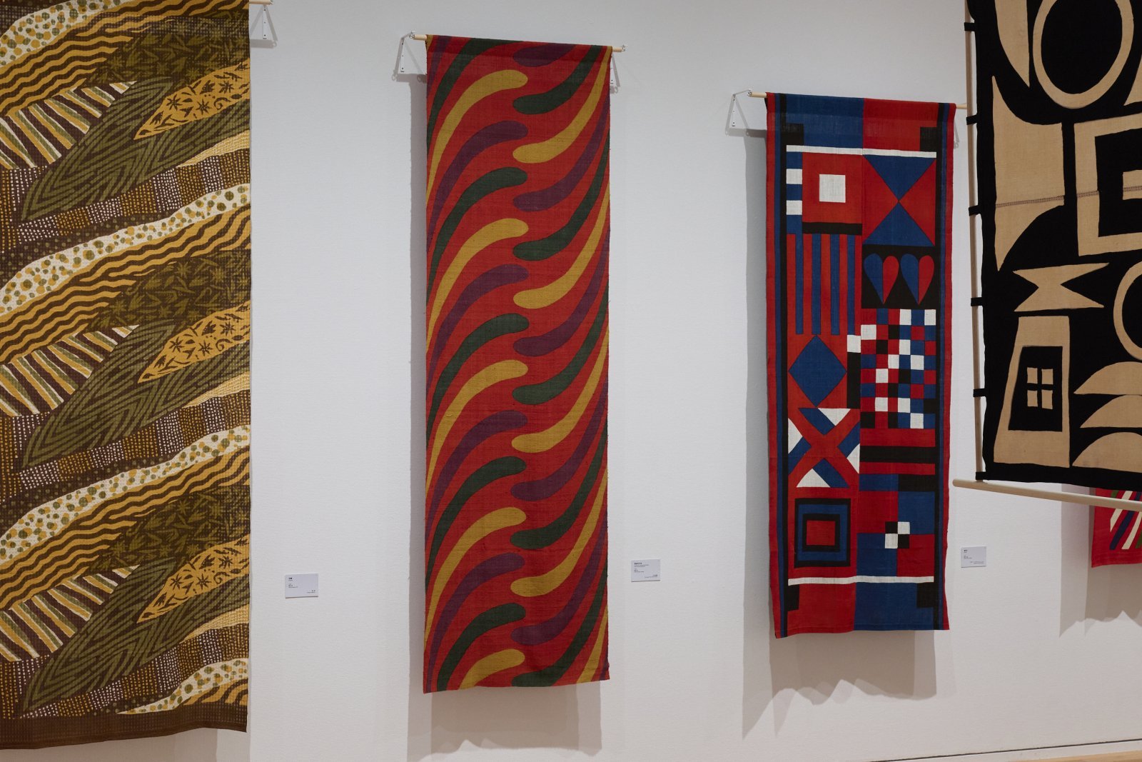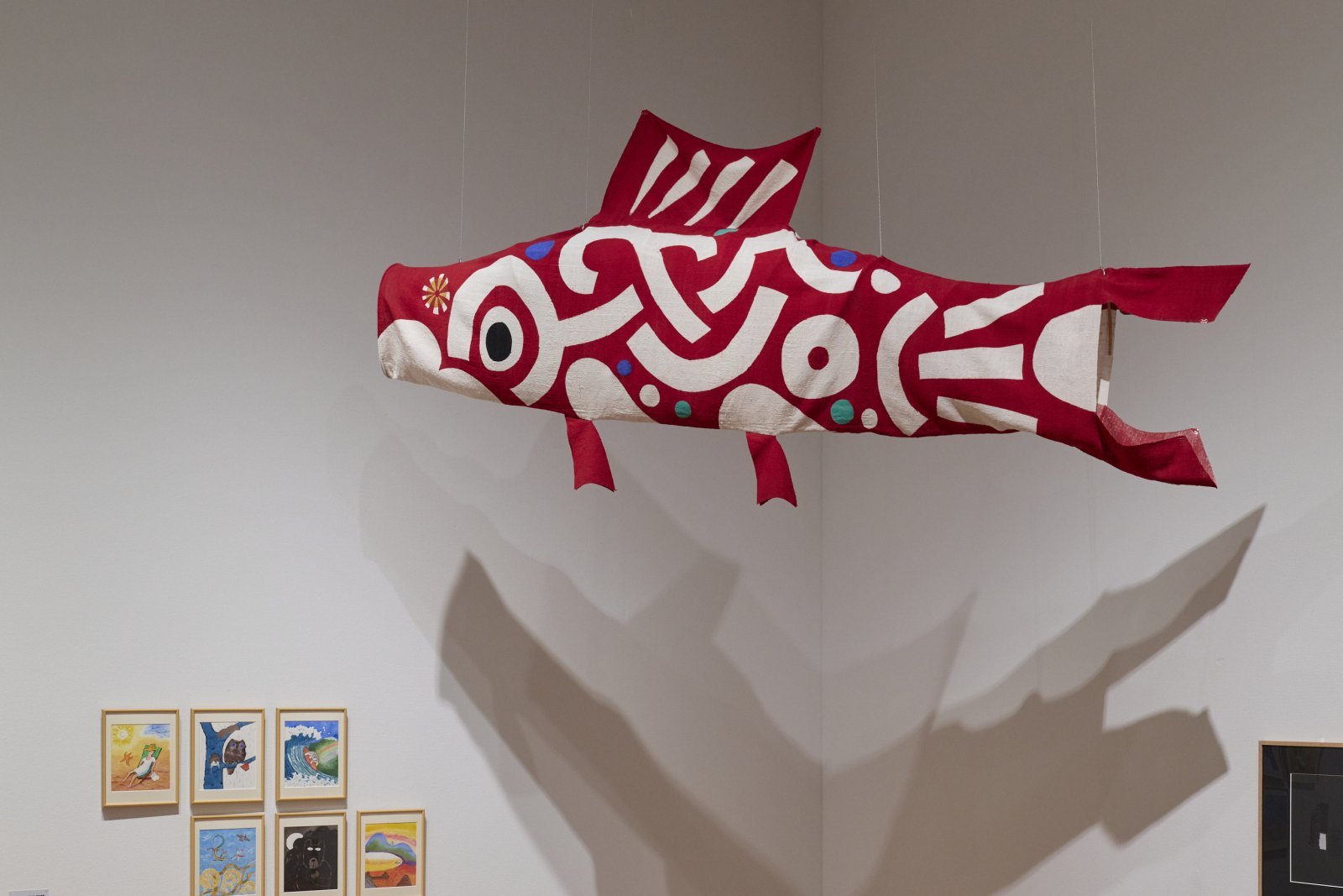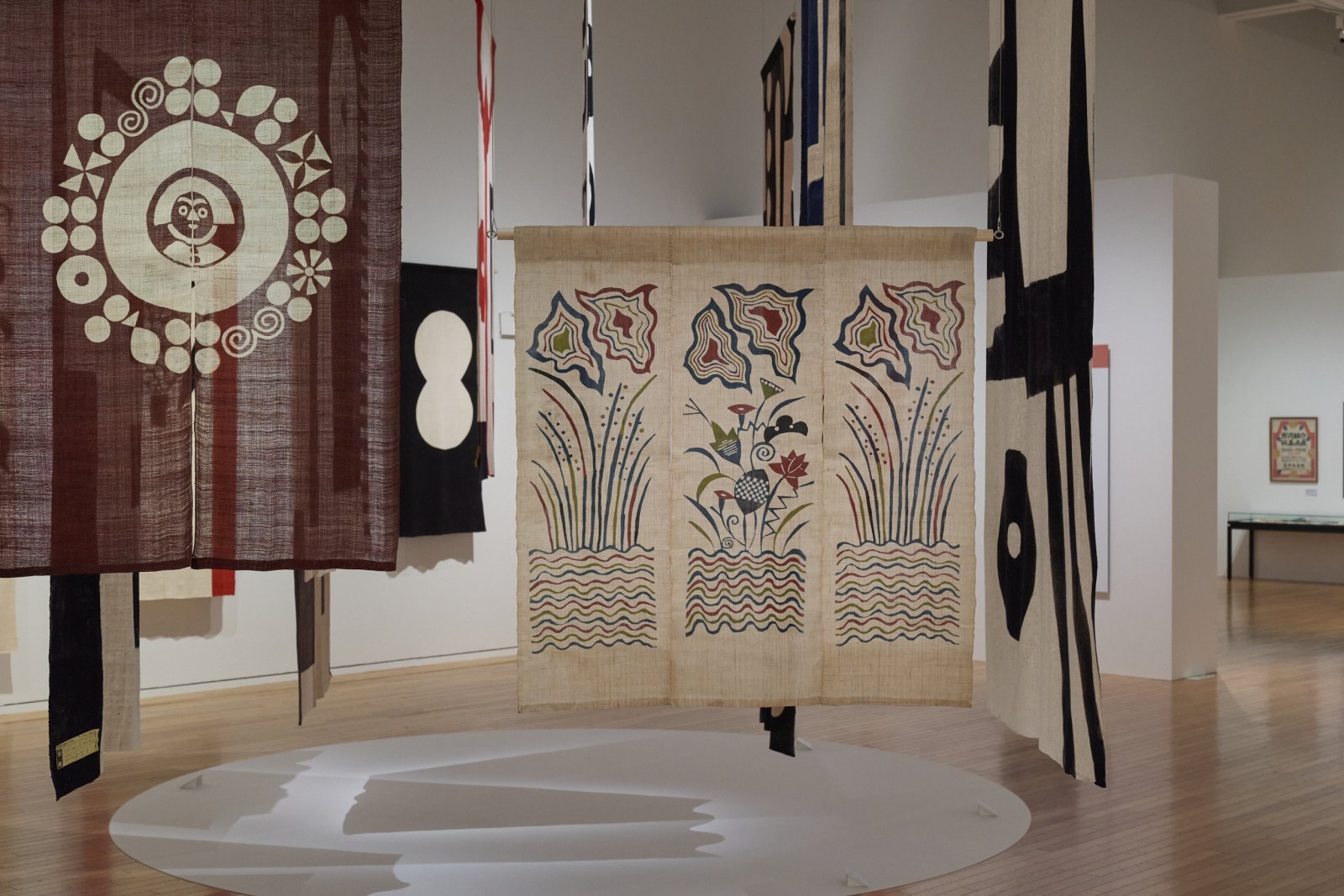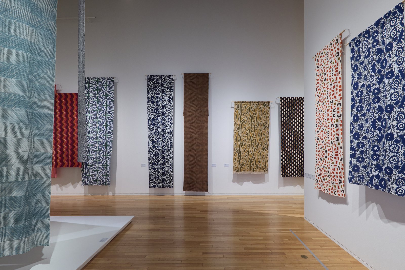 初期の代表作である『幕』とは、型染めした布を2枚縫い合わせ、棒を通してのぼり旗のように立てられるもの。黒地に白く染め抜かれた模様は、円や台形などのかたちで構成され、布いっぱいに散りばめられている。抽象と具象をはざまを行き交うような造形が魅力だ。一方でカラフルな『小鳥』は、文字通り小鳥のパターンを繰り返し、豊かな色彩へと還元。生命感のあふれる模様と色彩を見事に調和させている。
