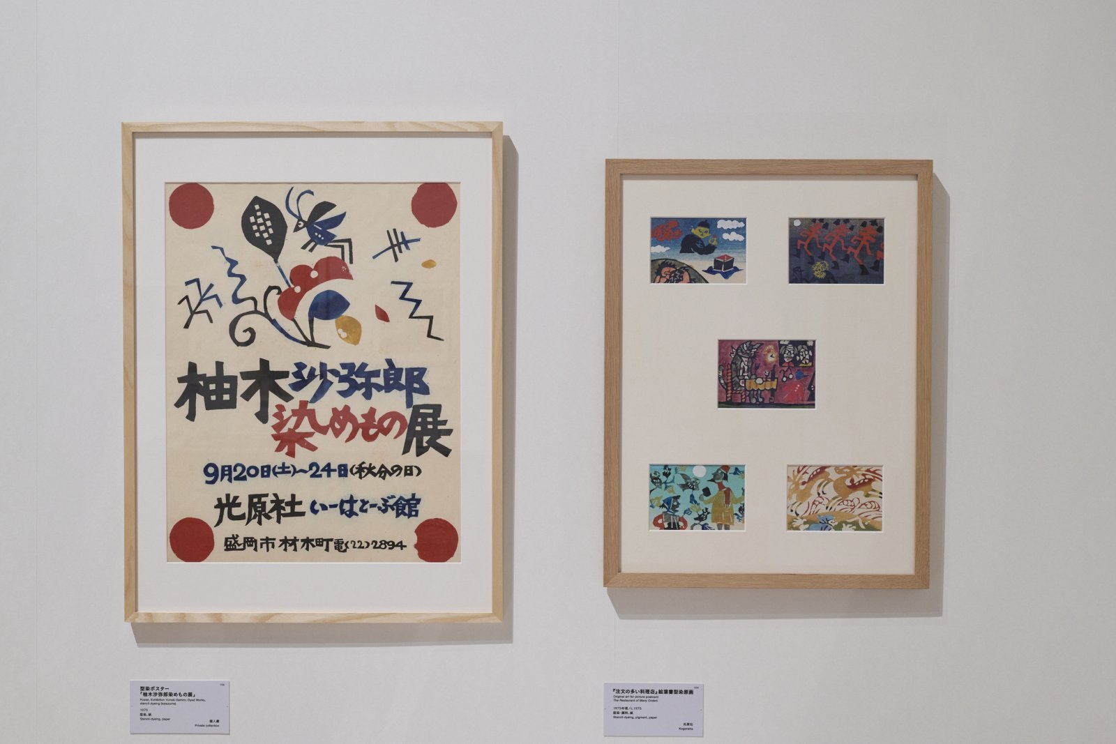 作家ゆかりの地や柚木の旅にまつわる作品や資料を集めた展示にも注目したい。染色家として柚木が活動をはじめた頃は、日本各地で民芸館が開かれた時期と重なる。よって民藝運動と関わりの深かった彼は、民藝にゆかりのある町を中心に多くの土地を旅した。最初の重要な地は、民藝と出会った場である岡山県。柚木の手掛けた「大原美術館」ロゴマークの印影や、『倉敷レイヨン連絡月報』の表紙型染原画などが展示されている。