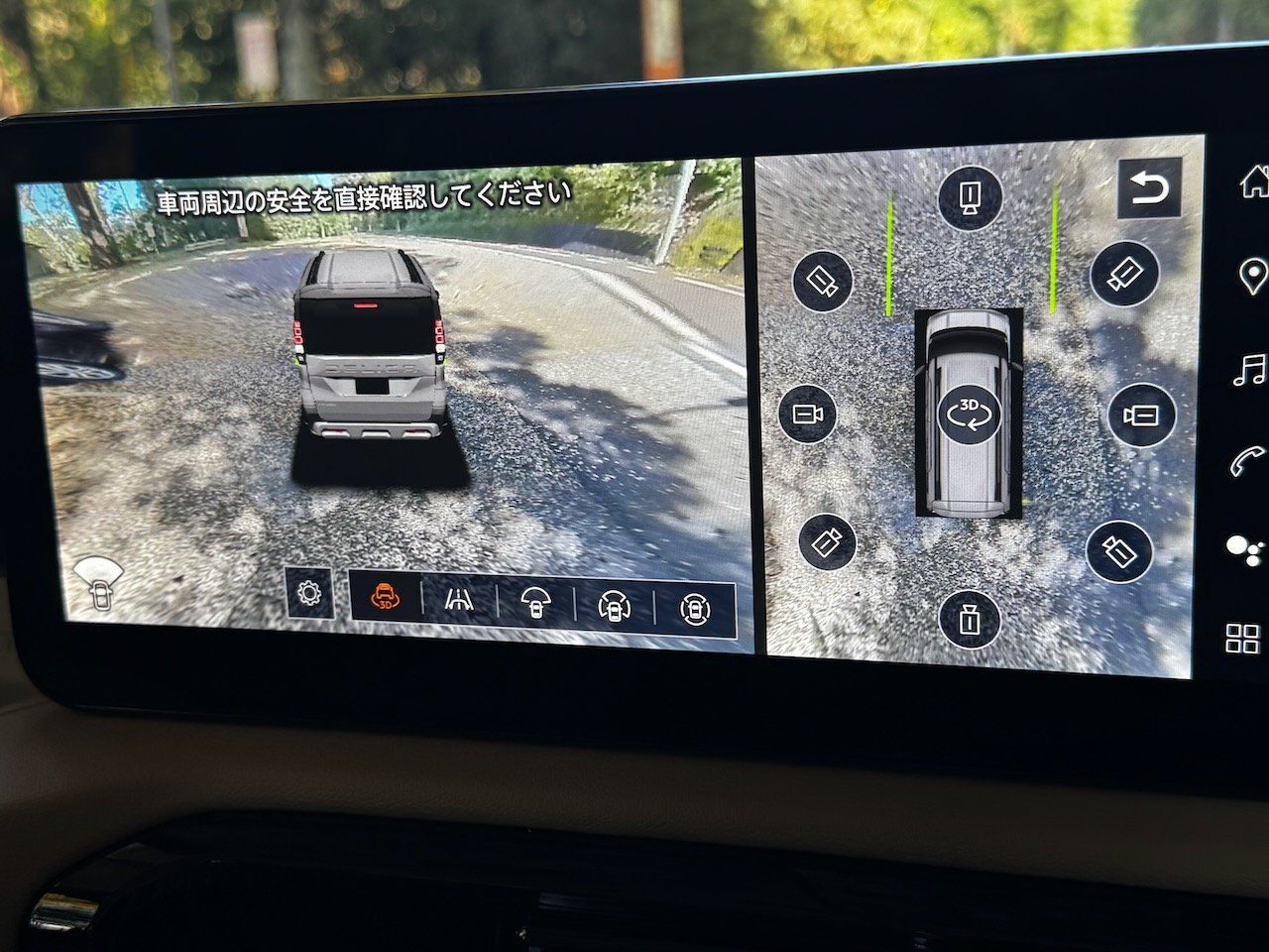 発進時の事故を防ぐために、ダッシュボードからカメラを起動すると、鼻先がちょっと出ていれば車両の両側が映像で確認できるし、前輪あたりの下部を透視映像で観ることが可能。
