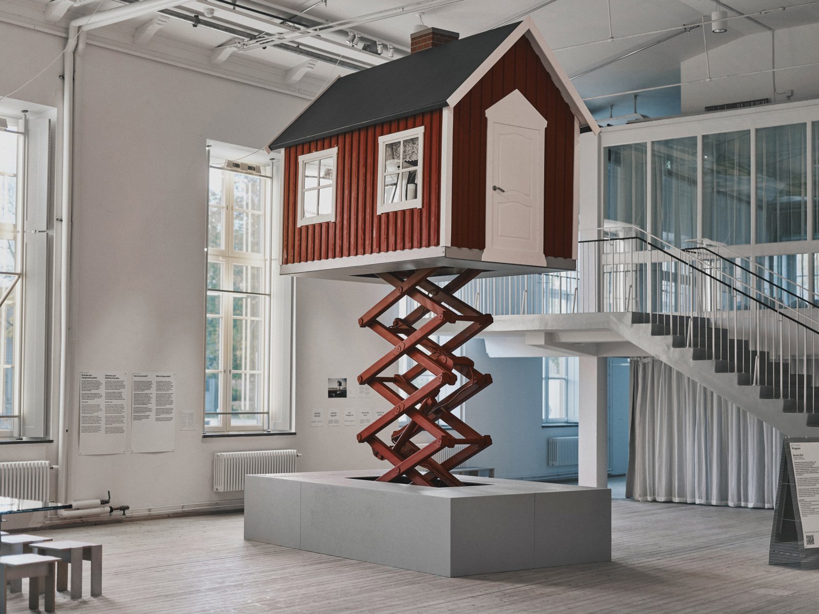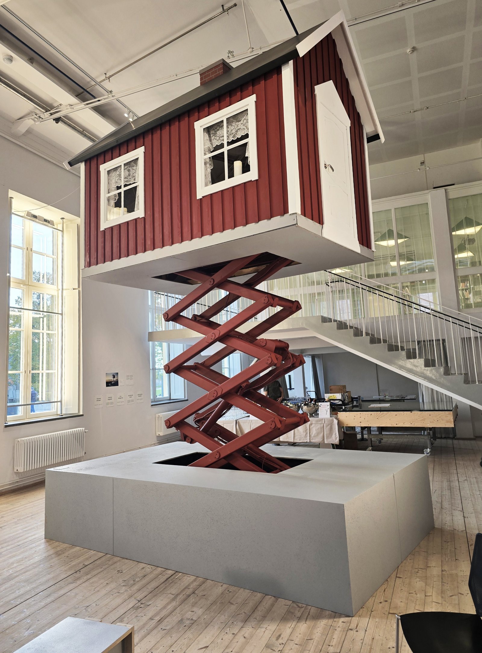 シザーリフトを使うというユニークな試みは、建物の約 80%にリサイクル材を使用して改修された「ArkDes」から着想を得ている。美術館で使用されていたシザーリフトが廃棄予定だと知ったメイェグレンが、そこに可能性を見出したのだという。リフト部分は、伝統的なスウェーデンレッドで塗装。そのプラットフォームとなるテーブル部分に、クラシックな木造パネル、切妻屋根、煙突を備えた小さな家屋が設置された。リフトの最大積載量が 227㎏だったため、家屋には精密な計算が求められたという。煙突から窓のレースカーテンに至るまで、あらゆる要素が設計され、計測され、調整されている。