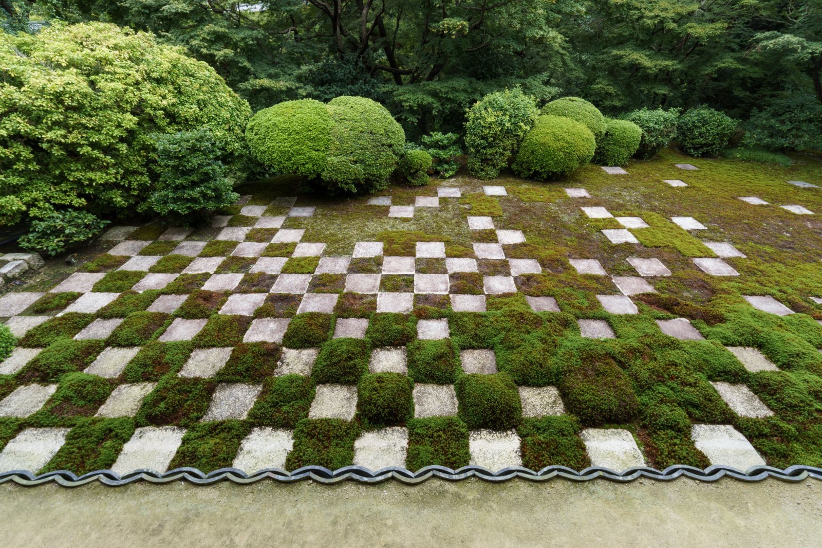 市松模様の苔庭は「北」。
