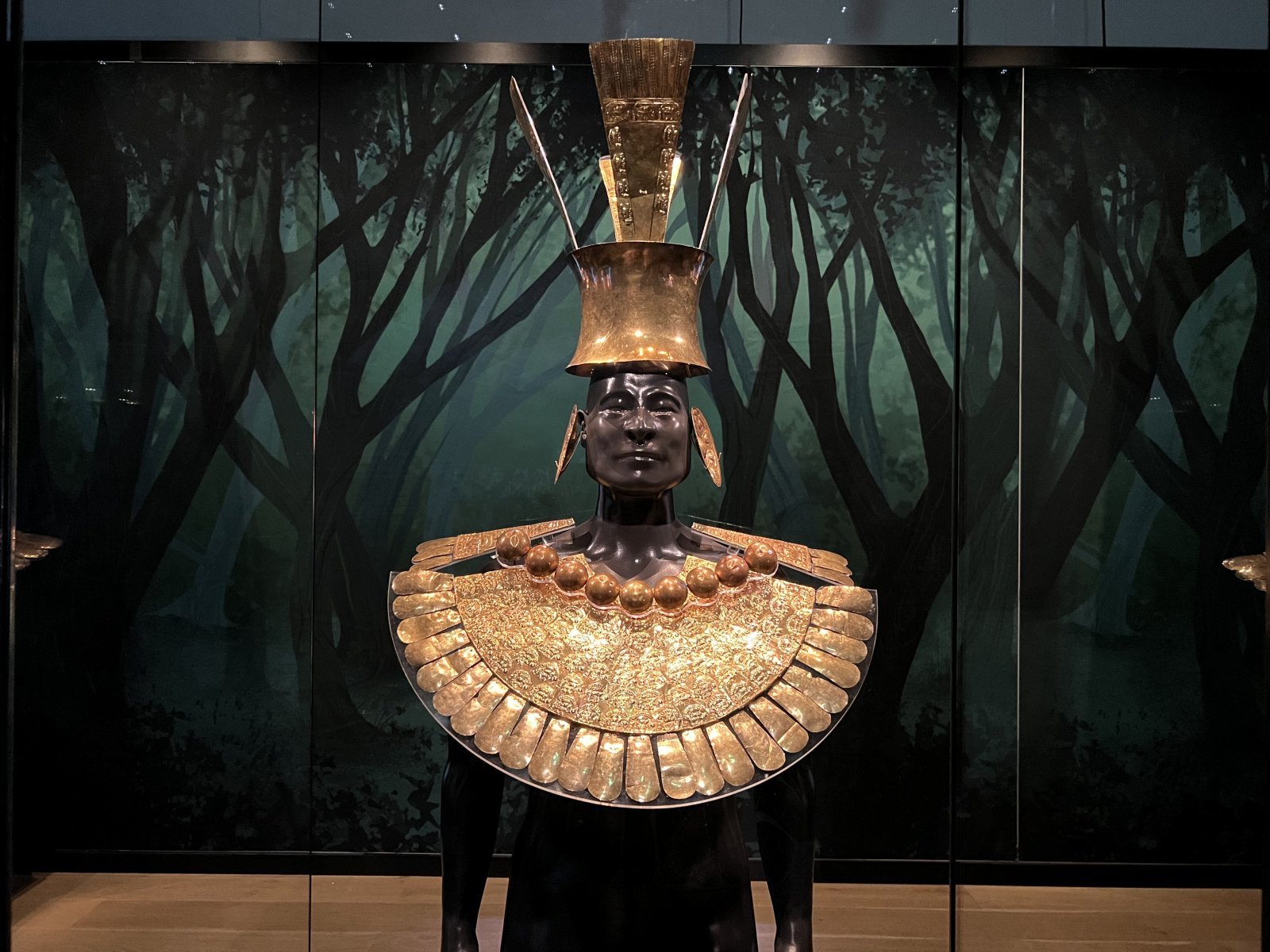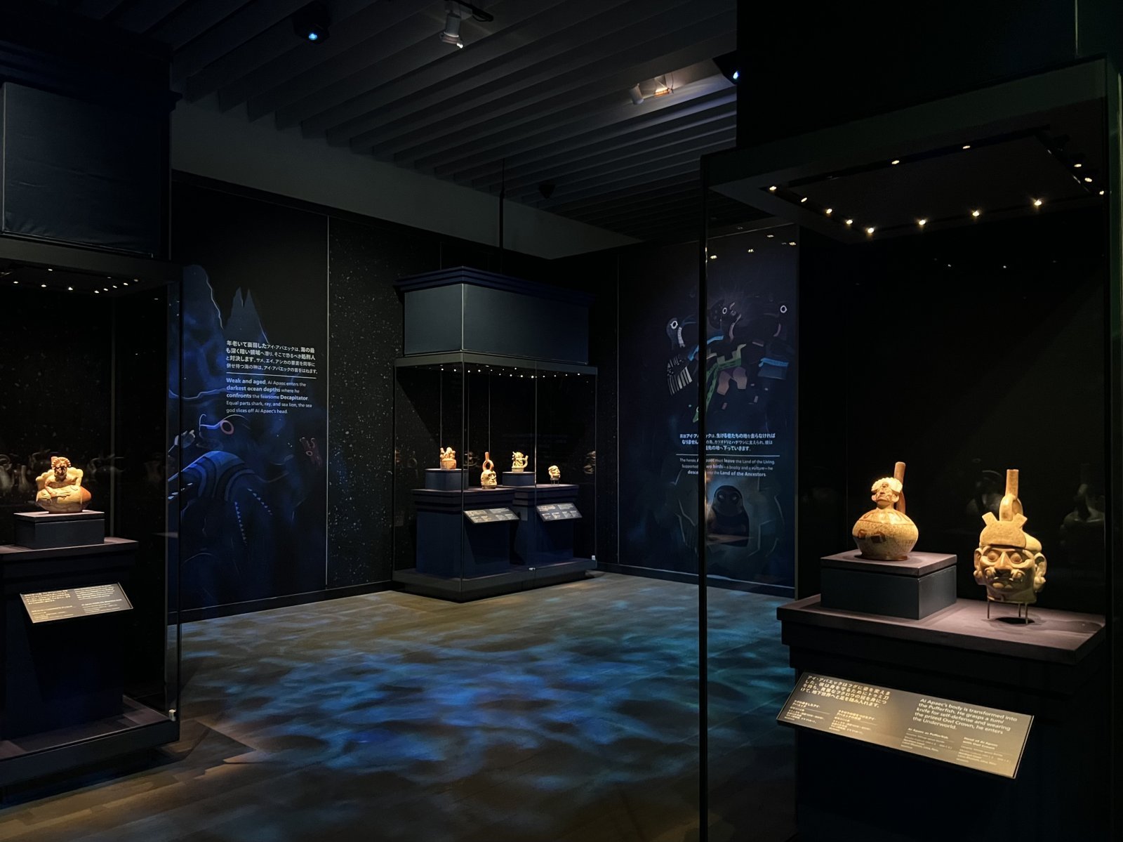 アンデスの支配者が実際に身につけていた装飾を、そのままの姿で間近に見られる展示も充実している。ここではモチェと継承者であるチムー王国の9人の支配者たちが、死後に神へと昇華される存在としてどのように葬られていたかを、金や銀で彩られた精美な副葬品とともに紹介している。鳥の形をした羽根飾り付きの冠やペリカンをモチーフにした耳飾り、カエルの象った首飾りなど、多彩で精緻な意匠からは、アンデスの卓越した金工技術と美意識を感じることができる。