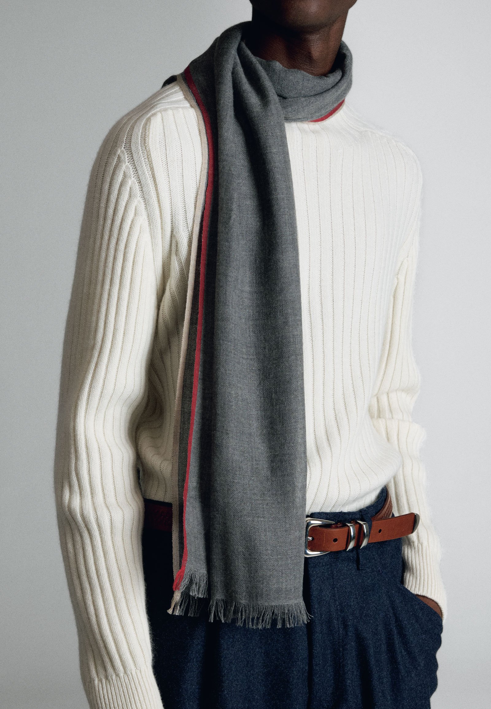 カシミアの原産地、ヒマラヤ山脈の北に位置するインド・ラダックで暮らす人々との対話を重ね、彼らの自然・伝統・職人技を守り、未来へ紡ぐ試みから生まれた特別なストール。エアリーな質感のグレー地に、ベージュとバーガンディの縁取りがアクセントとして華やぐ。ストールの織り目一つひとつに、ヒマラヤに息づく悠久の時が凝縮されているかのようだ。