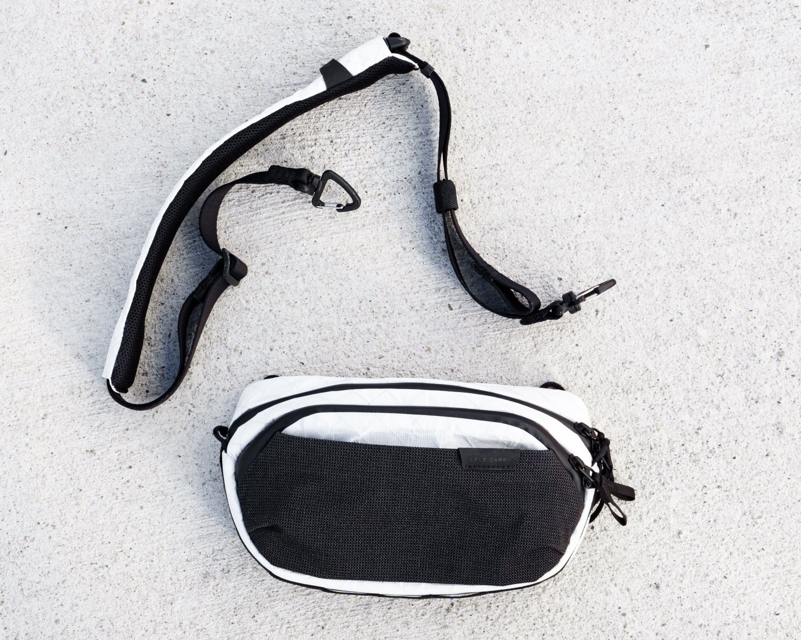 本体素材は固く頑丈で耐水性が高い、ヨットの帆由来の「Ultra200X」。本体下部にマチがあり、物を入れると少し広がる。収納品が少ないときは全体が逆三角形のスマートなシルエット。カーブした構造の効果もあり、肩にラフに突っ掛けても斜めがけしても身体に馴染む。