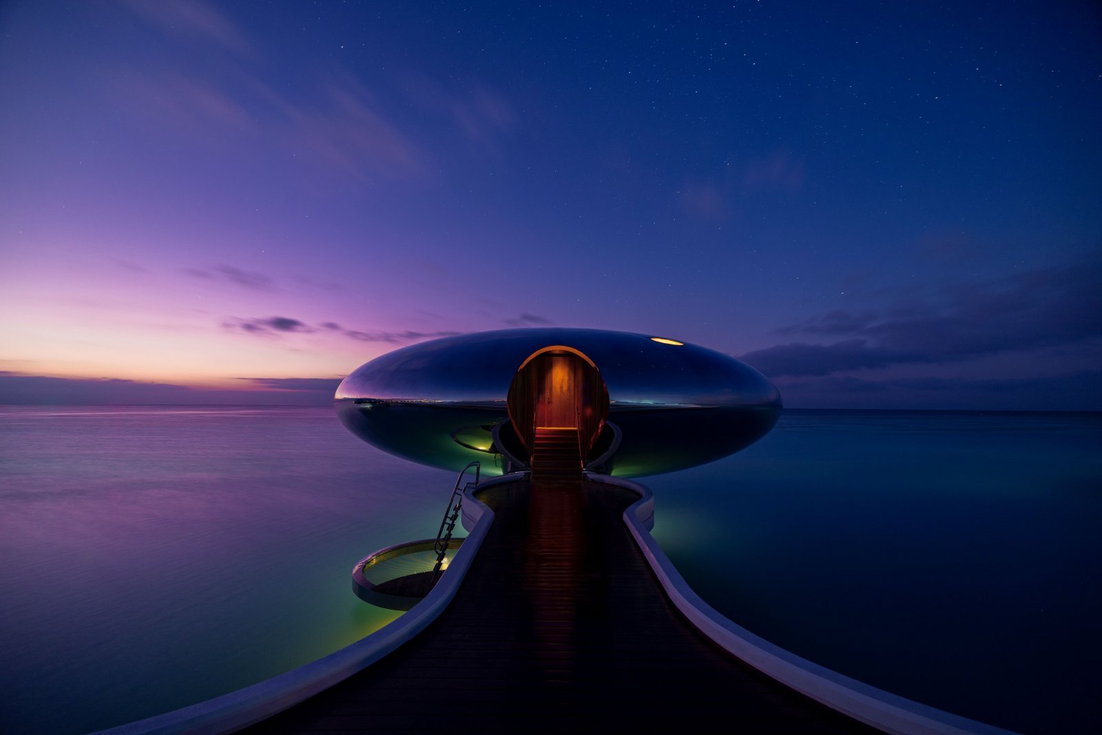 このリゾートを特徴付けているのは、ドラマチックなデザインの 73 棟のヴィラだ。近未来を思わせるきらめく銀色のポッドはステンレス製で、それぞれの内部に客室が埋め込まれている。水上ヴィラは真珠の連なりのように海に浮かぶ鎖を形成。ビーチヴィラは淡い砂の上に佇み、周囲の物を映し出しながら水平線と一体化する。この眺めは第一印象としては圧倒的で、まさに未だかつてない超豪華リゾートを象徴するものと言える。