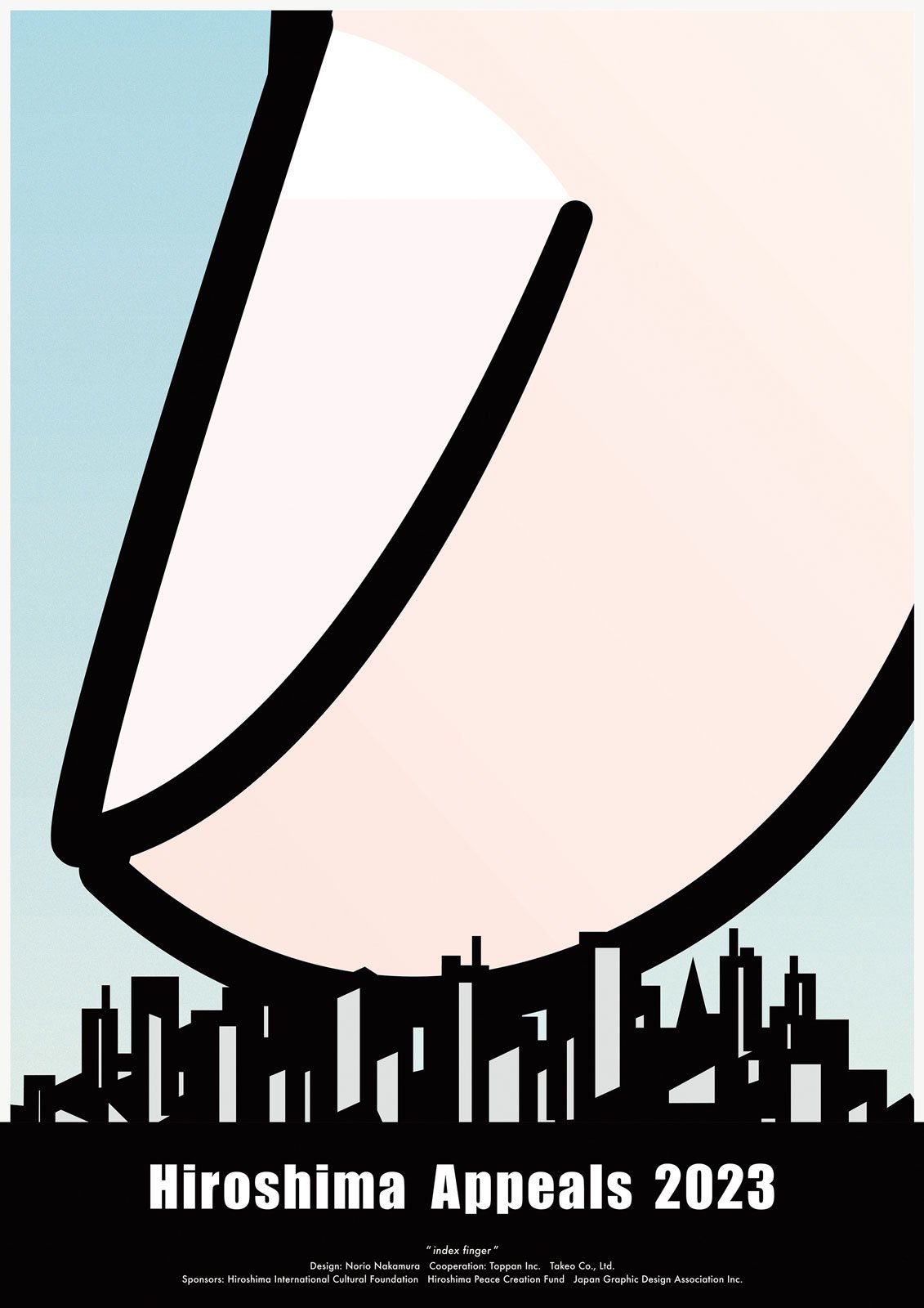 JAGDA(日本グラフィックデザイン協会)を代表するデザイナーが毎年一点、ボランティアでポスターを制作する「ヒロシマ・アピールズ」。中村至男が2023年に手掛けた作品『人差し指』は、ほんの一撃で街を破壊してしまいそうな大きな指先を「人間の弱さの象徴」として描いた。 佐藤雅彦と制作したプレイステーション用ゲームソフト「I.Q Intelligent Qube」(1997年)