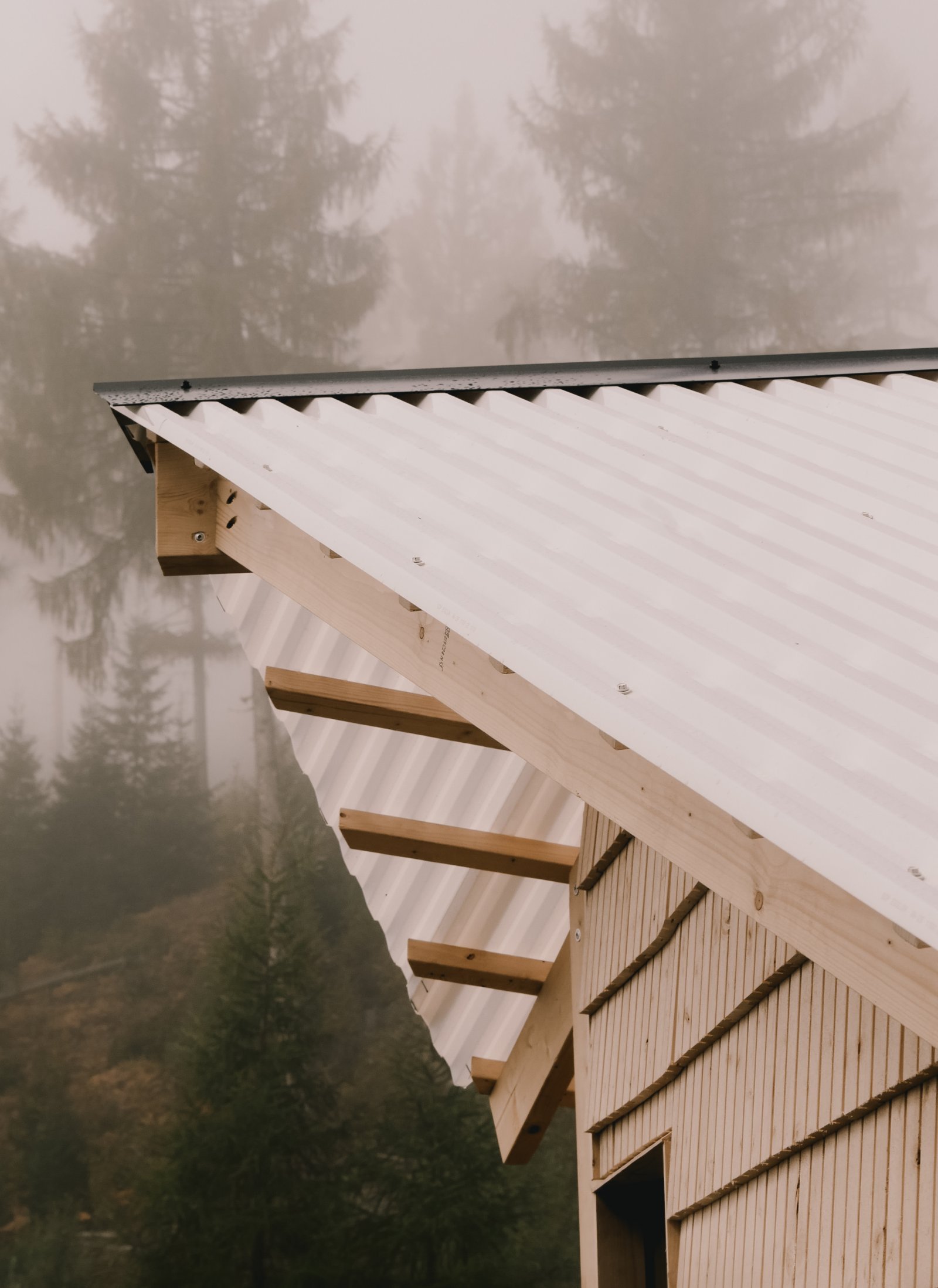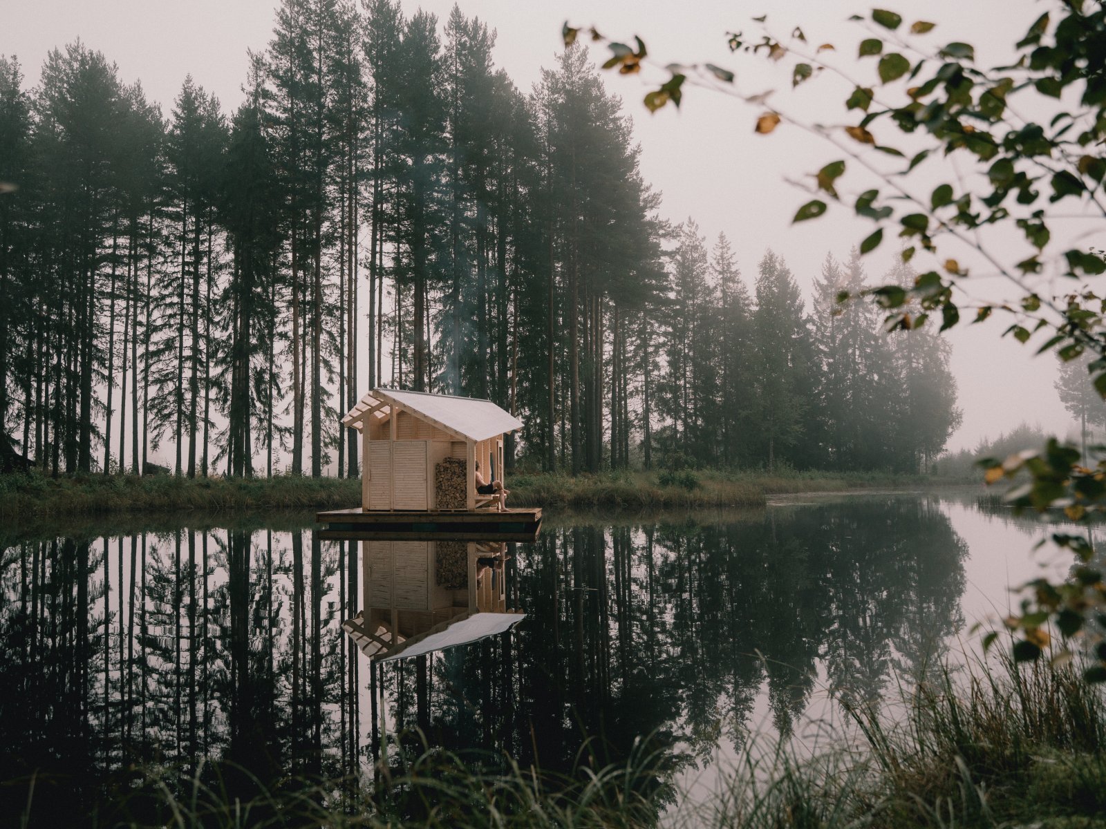 外装には、余ったパネルを利用した。丹念に板状に切り出して建物の外観に質感とリズムを加えており、即興的ながらも、丁寧な仕事ぶりがうかがえる工夫だ。内部の壁は、焦がし加工と亜麻仁油で仕上げを施した暗色のパネルで覆い、深く包み込むような温かさを醸し出している。室内に設置された明るい色のポプラ材のベンチとは対照的だ。内部照明は最小限に設定。薪ストーブの炎、窓から入り込む光、そして窓の外の水面に映る光の反射のみが光源となっている。窓は1つだけで、意図的に極めて低い位置に置き、湖と森を完璧にフレームに納める設計にした。外から内へ、冷から温への移行というサウナ体験をさらに充実させる、心休まる空間が出来上がっている。