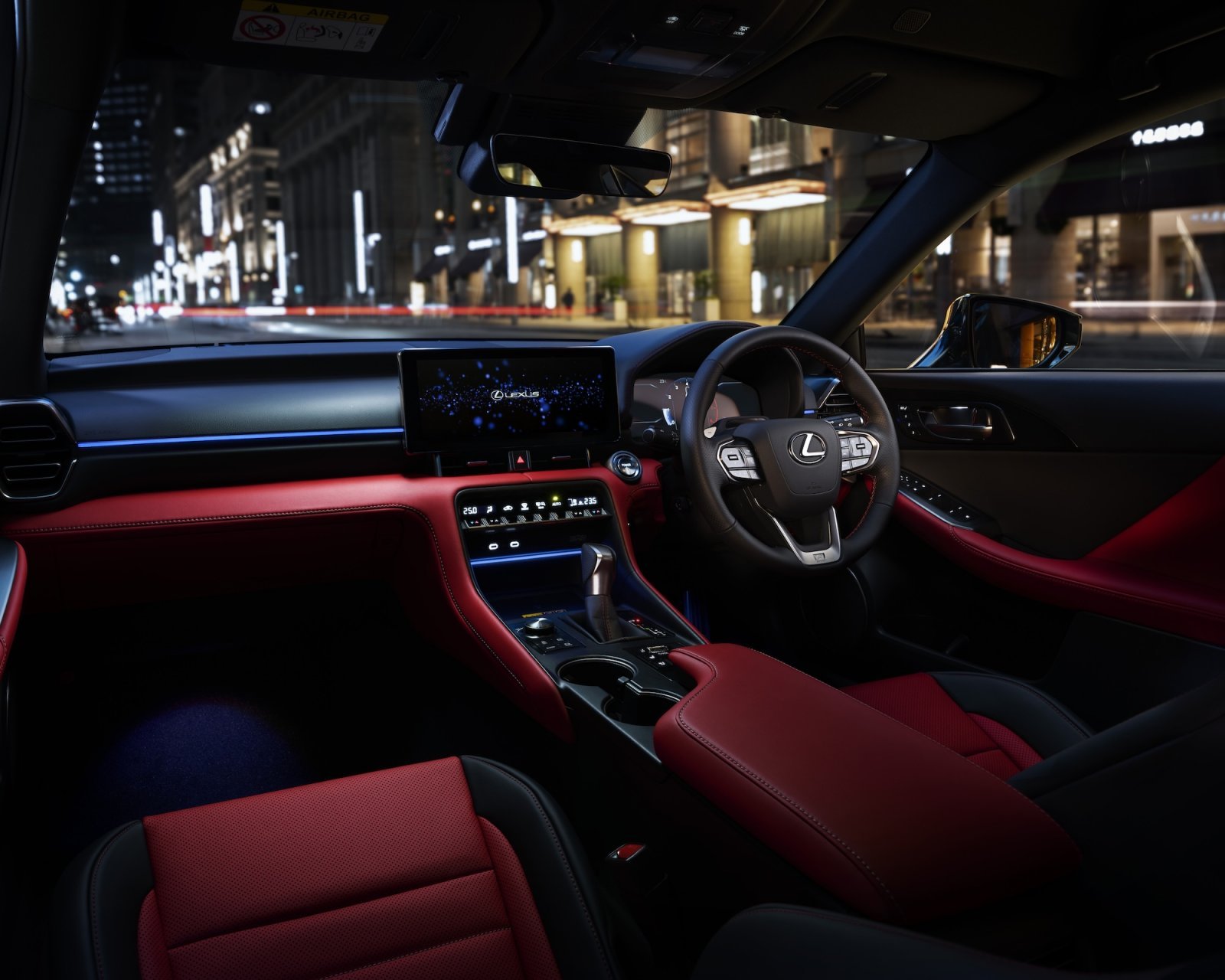 またインテリアは、12.3インチの大型ディスプレイとメーターを備え、視認性と操作性を向上。竹素材を用いた新意匠のパネルや、F SPORT専用の新内装色も設定された。