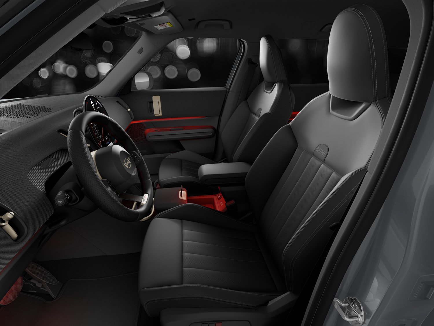 エクステリア、インテリアともにブラックとグレーのダークカラーで統一し、都会的でシックな印象に。ユニオン・ジャックをモチーフとしたヘリテージ・ミラー・キャップがミニらしさを表現する。インテリアは、ベスキン・ブラック・シートを採用し、ダッシュボードやドア・トリムもすべてブラックで統一され、落ち着きのある上質なキャビンに仕上がっている。