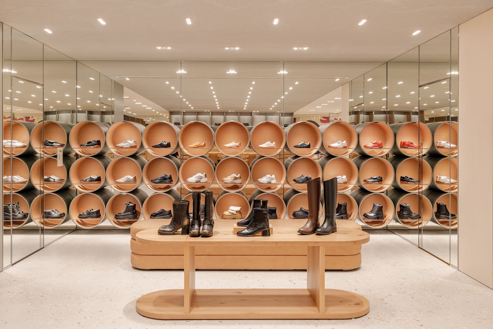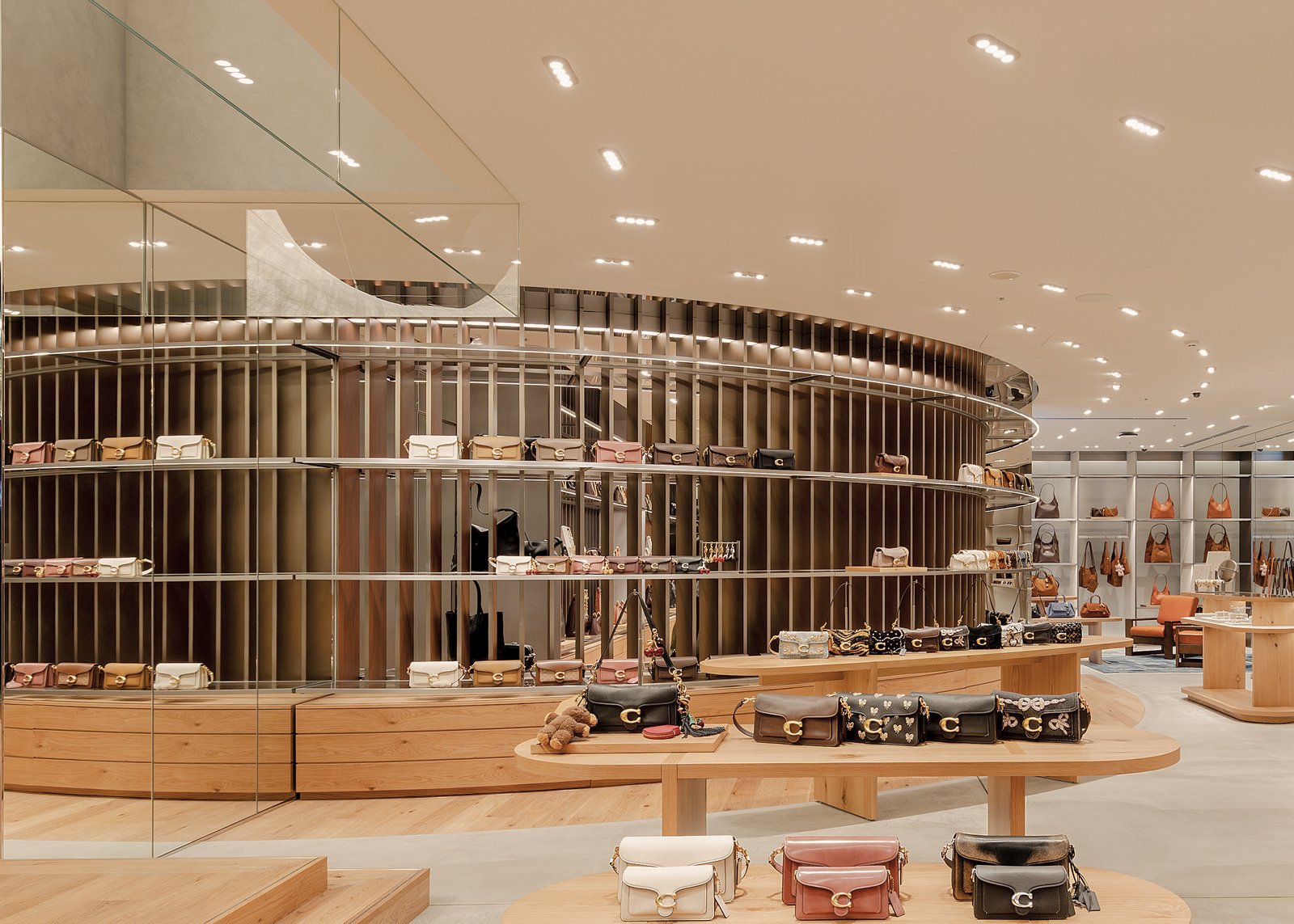 中央通りの角地に立つ建物は、を思わせるライトブロンズの外壁が印象的だ。ブランドを象徴するC形のスカルプチャーがガラス越しに存在感を見せ、行き交う人々の視線を自然と引き寄せる。店内はニューヨークの街並みを想起させる縦ルーバーを基調に構成。オーク、ブラックメタル、テラゾなど質感の異なる素材を組み合わせて、空間に奥行きをもたらした。バッグやシューズなどのレザーグッズは、オブジェのように1点ずつていねいに配置される。階段の壁には日本人アーティスト・ キーニュによるアートワークが描かれ、空間に彩りを添えた。