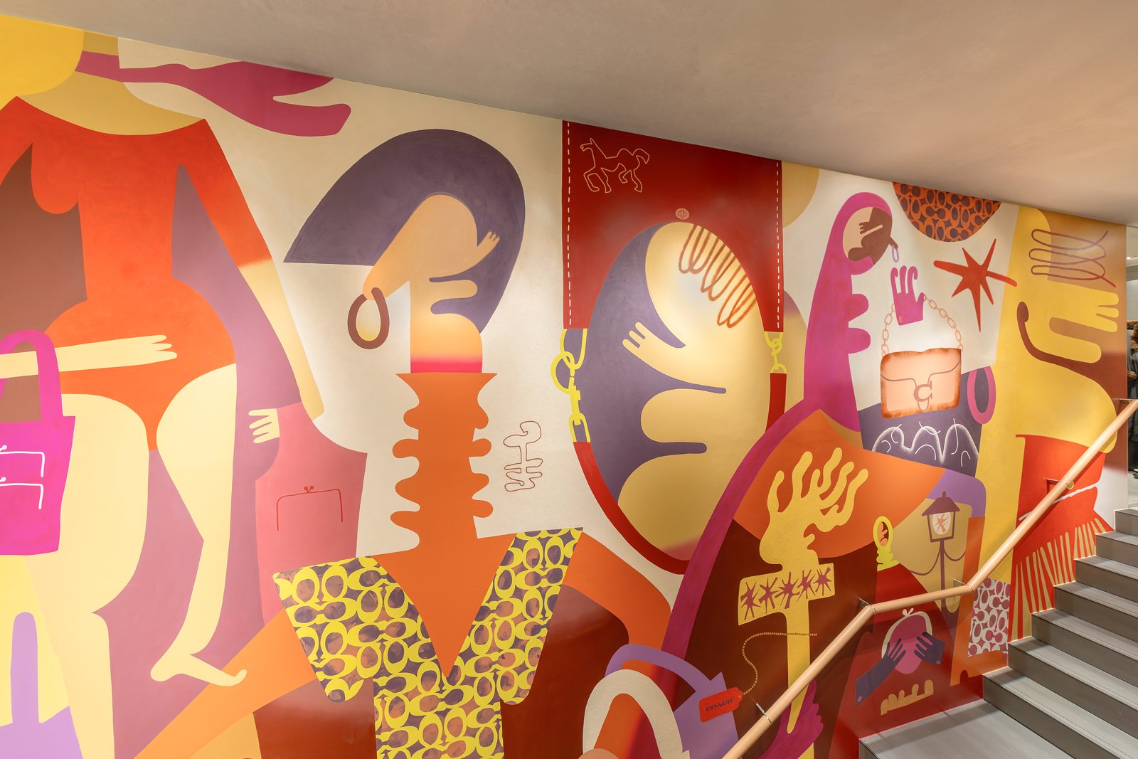 階段の壁面に描かれたキーニュによるアートワーク。コーチのバッグやシグネチャー柄などの要素を、グラフィカルに構成している。