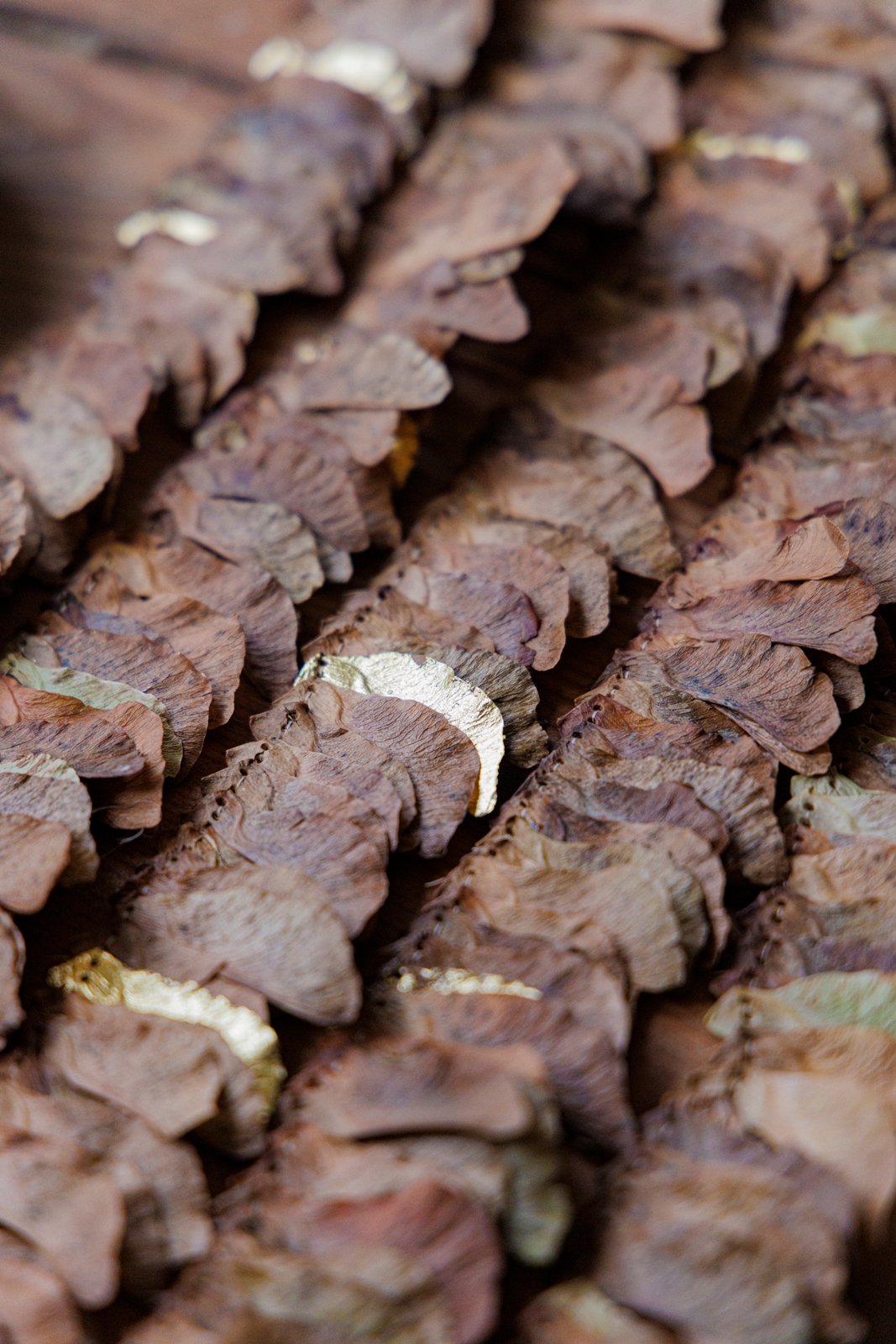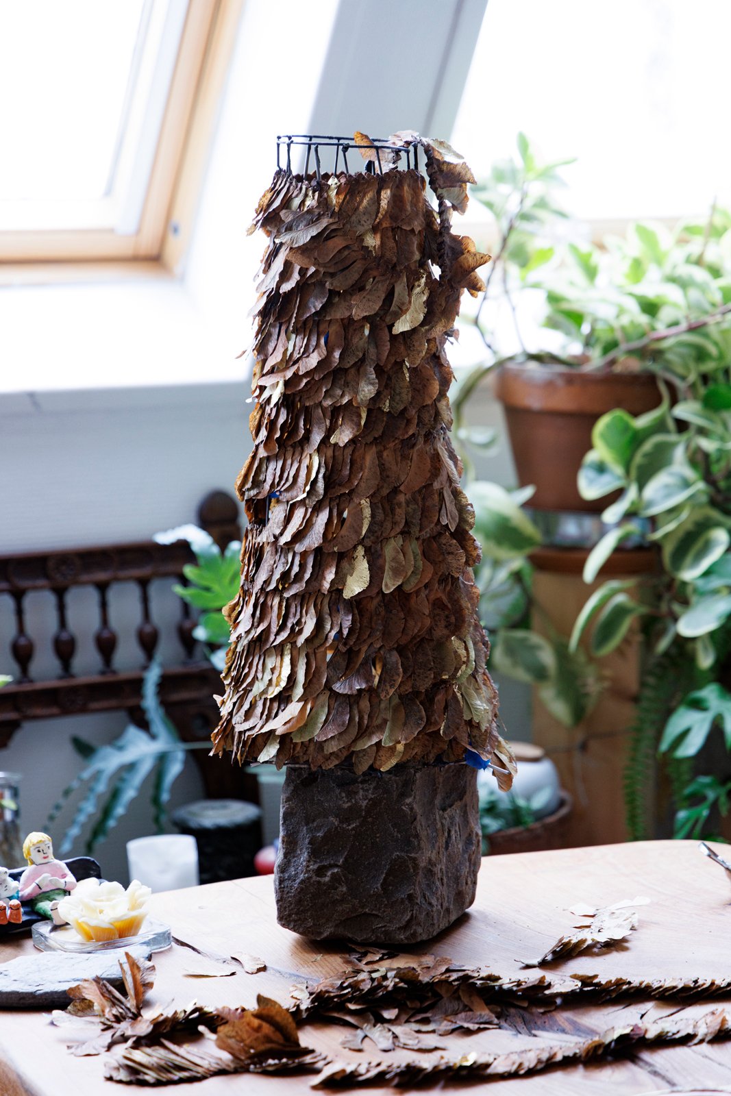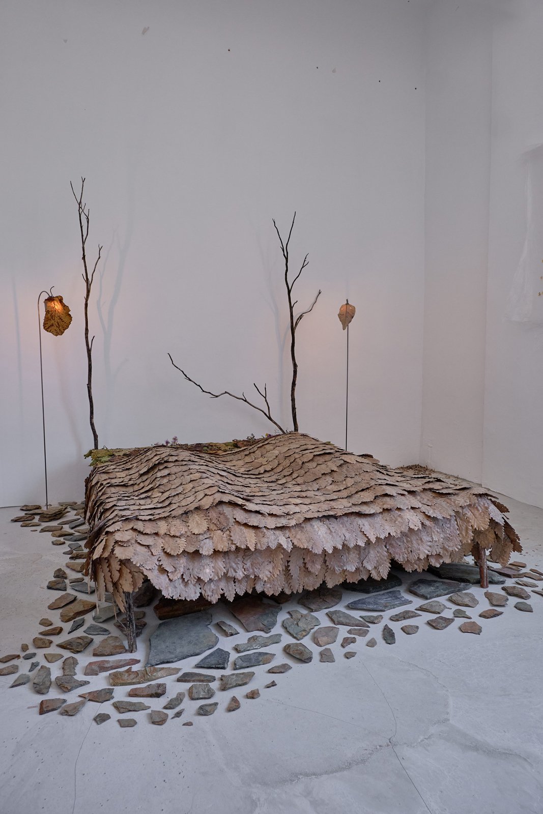 スチールワイヤーで制作したフレームにさまざまな樹種の落ち葉を敷き詰めて、枝木をベッドポストにしたベッドは、ワイヤーと植物のどちらが欠けても成り立たない。繊細なワイヤーの椅子は、座面も背もたれもすべて拾い集めた木の葉でできているから、時とともに朽ち、形状が崩れていく。