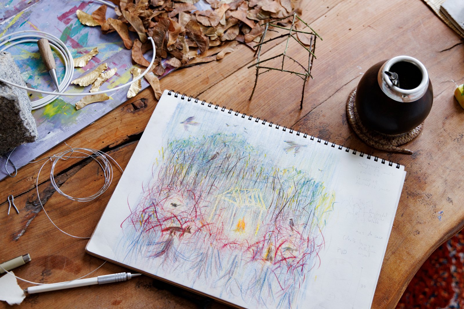 タカダはフェスティバル開催地を取り囲む森や丘の小道に分け入り、そこから枯れた花の茎や、山火事によって炭化したコルク樫の樹皮、落ち葉、石を拾い集め、それらを工業的な素材であるスチールワイヤーと組み合わせてベッドやテーブル、椅子、床をつくり、室内空間を生み出した。手近にある材料を活かした家具たちは、原始的でもあり、牧歌的でメルヘンを感じさせる。過度に加工することなく純度の高いものづくりをしたいという、タカダの想いが込められている。