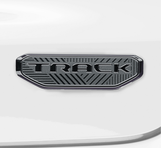 エクステリアは、ボディー同色のフロントフェイシアとホイールフレア、シルモールディングに加え、グレーのアクセントを施し、スタイリッシュな印象に。ジープロゴバッジを従来のクロームからグロスブラックへと変更し、専用の“TRACK”バッジを装着する。