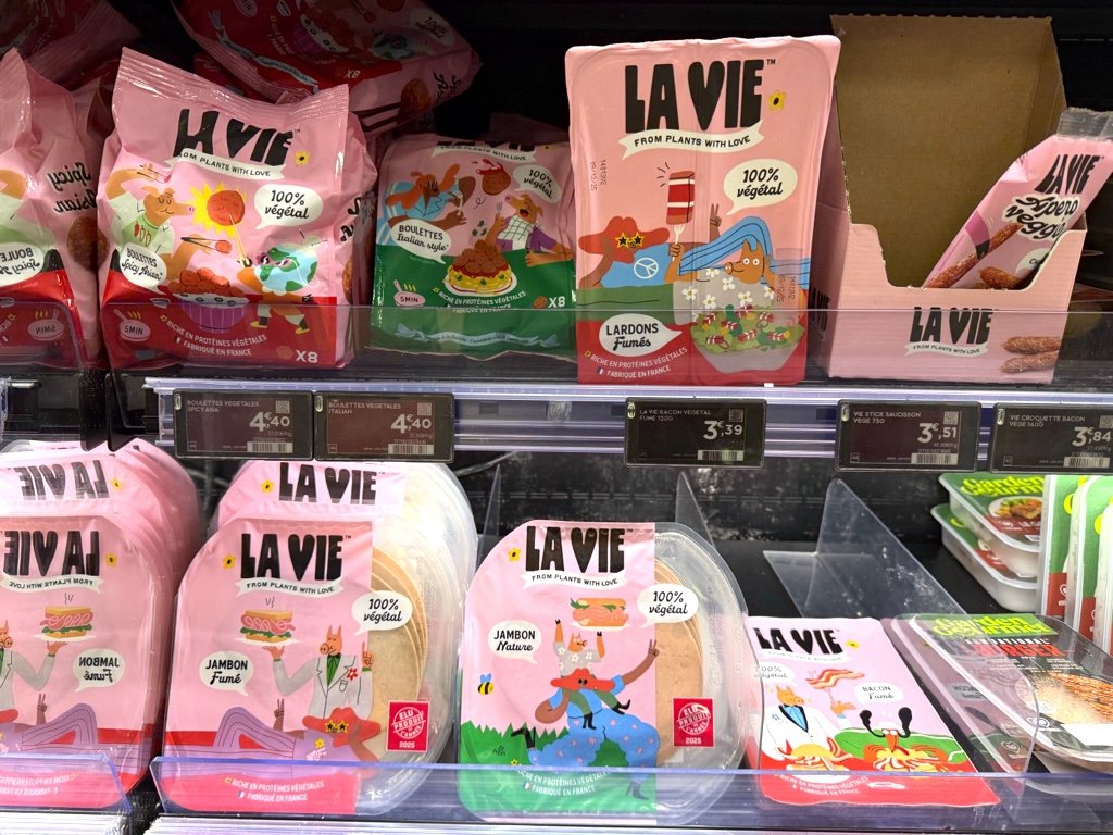 プラントミートは、すでに外食シーンにも入り込んでいます。「La Vie」は、フランスのBurger KingやKFCでは、植物由来のベーコンやチキン代替メニューが提供され、特別なメニューというより、選択肢のひとつとして並んでいます。また、スペイン発の「Heura」は、黄色いパッケージと分かりやすいメッセージで、フランスの売り場でも存在感を放っています。