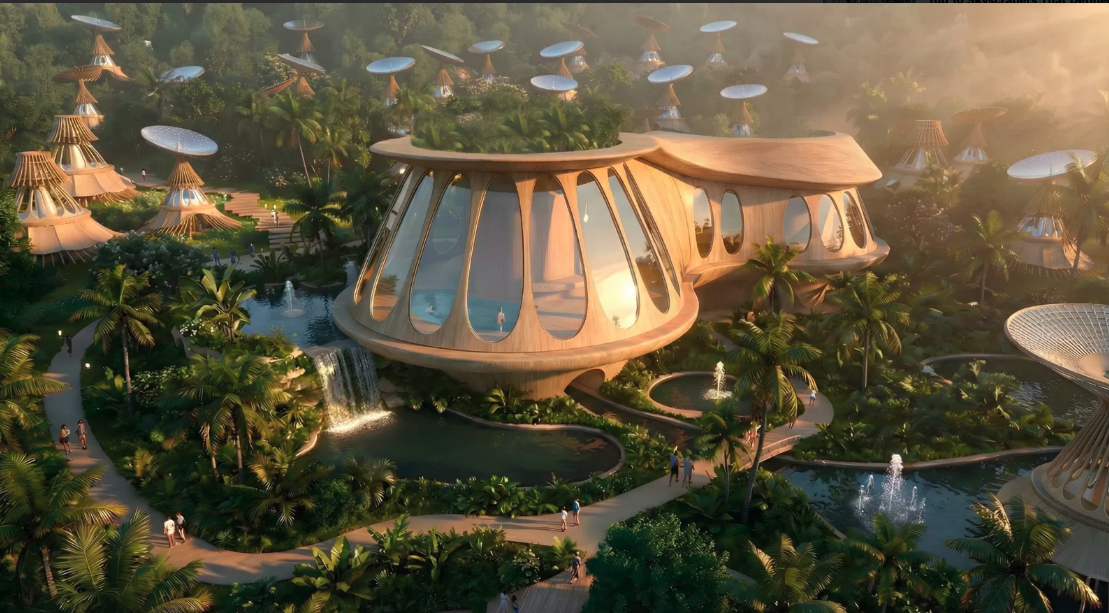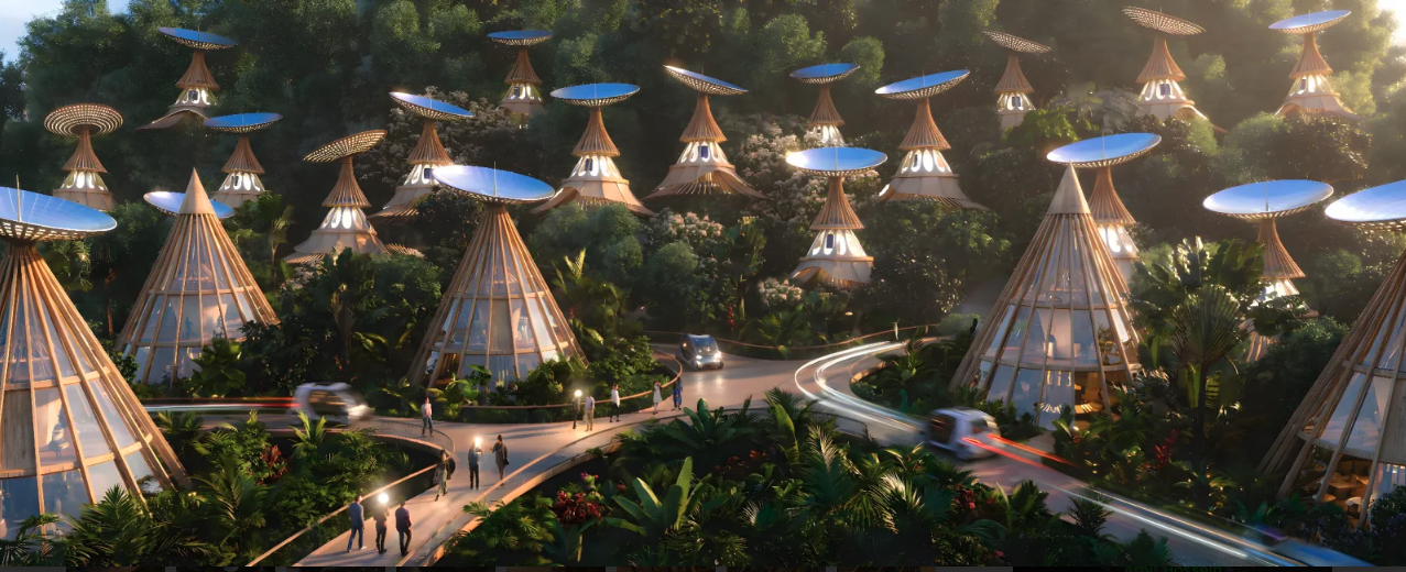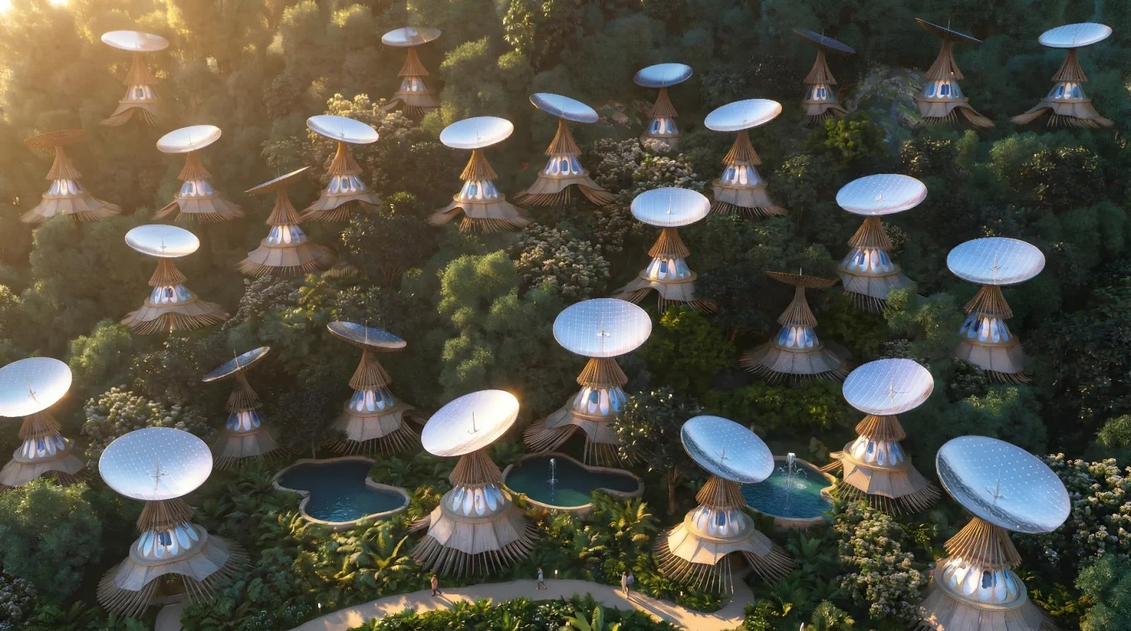 森の中に静かに佇む集落。伝統建築のようでありながら、各戸の屋根にはまるで大きなパラボラアンテナのような物体が鎮座し、近未来の光景を思わせる。そんなめずらしい建築コンセプトが登場した。