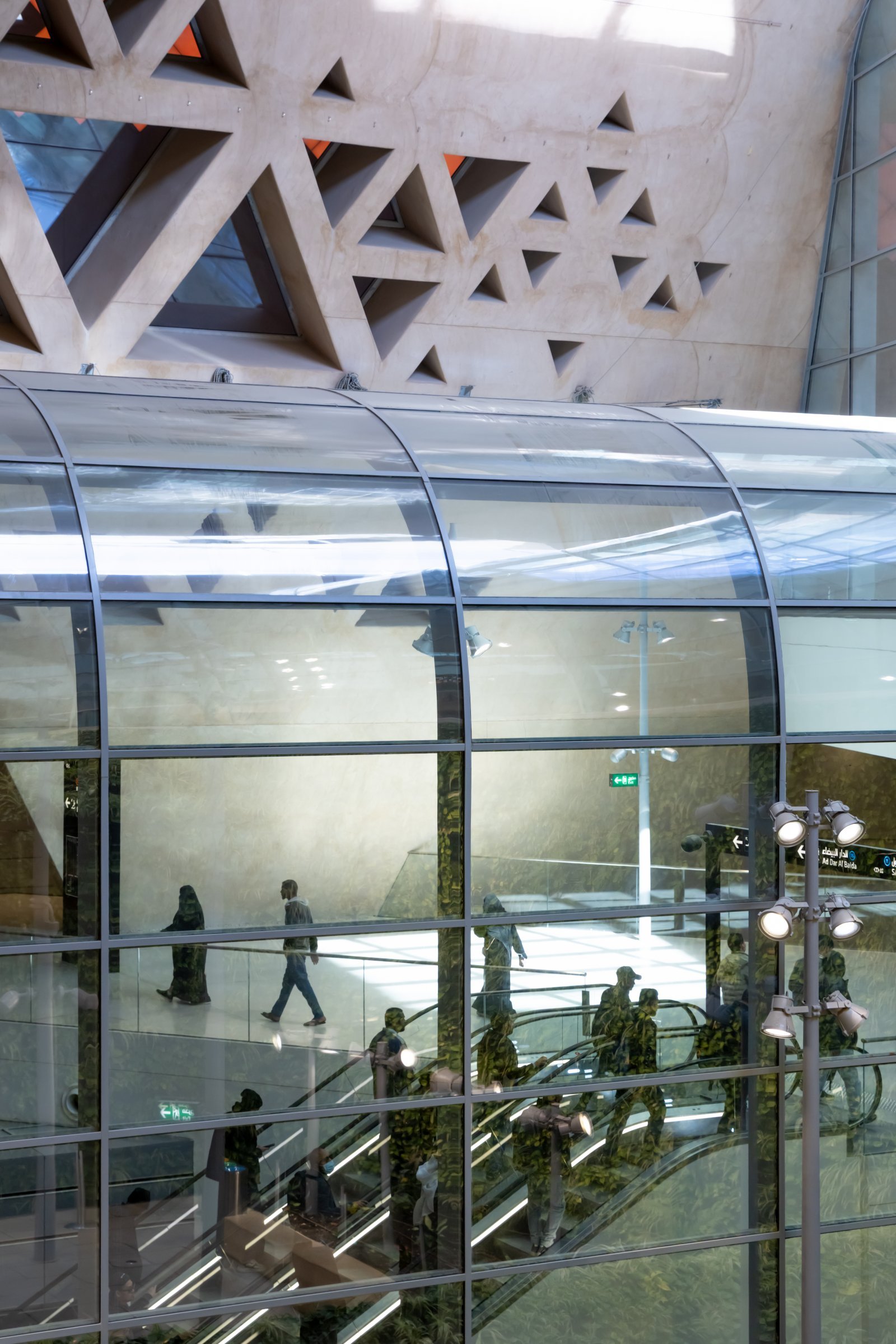 駅の内壁には、地域の伝統建築に着想を得たデザインが施され、深く根付いた歴史の遺産がモダンなデザインに溶け込んでいる。駅内部はアトリウム(吹き抜けの中庭風空間)になっており、そこに突き出たガラス張りのチューブ内にプラットフォームが収められている。内部と外部がシームレスに一体化され、到着と出発の乗客の両方が、プラットフォームエリアから壮大なアトリウムの空間を見渡せるよう設計された。アトリウムの底には庭園が設けられており、乗客は電車を待つ間に日陰の緑豊かな空間でリラックスすることもできる。地下 35 メートルに位置するこの庭園では、暑い夏季でも穏やかな環境が維持されている。