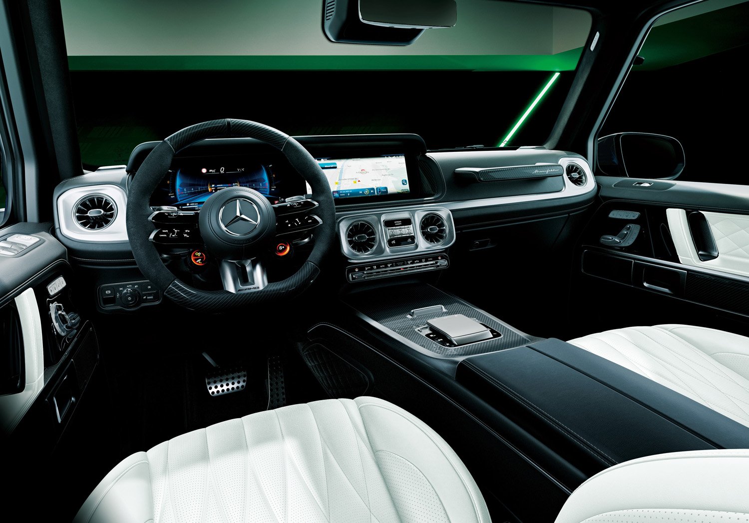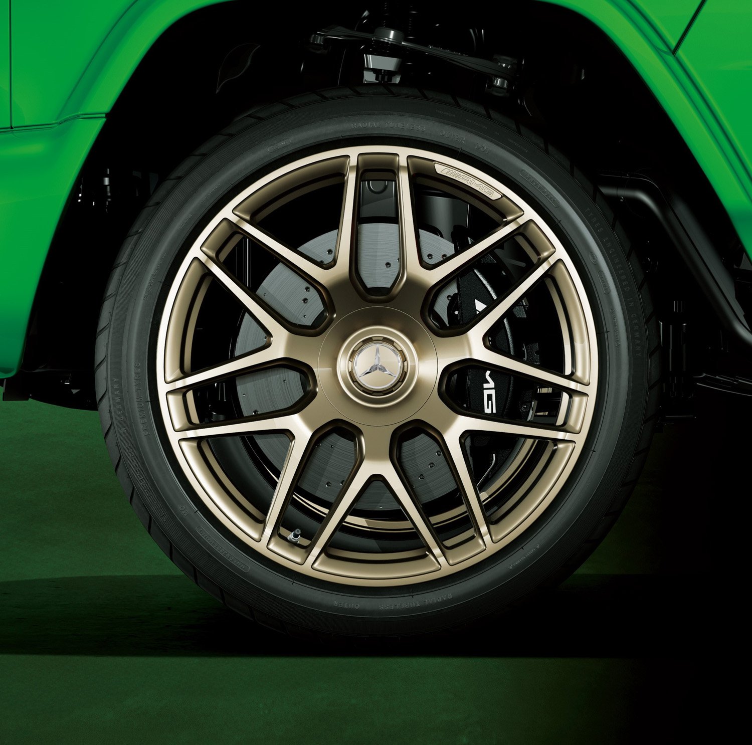 「G 63 Edition Performance」は、エクステリアに専用装備が多数。外装色には通常モデルには設定のない専用カラーとして「MANUFAKTURサンイエロー(ソリッド)」「MANUFAKTURグリーンヘルマグノ(マット)」「MANUFAKTURカッパーオレンジマグノ(マット)」の3色を設定し、ホイールには本モデル限定となるゴールド(マット)の「MANUFAKTUR 22インチ AMG鍛造アルミホイール」を採用している。