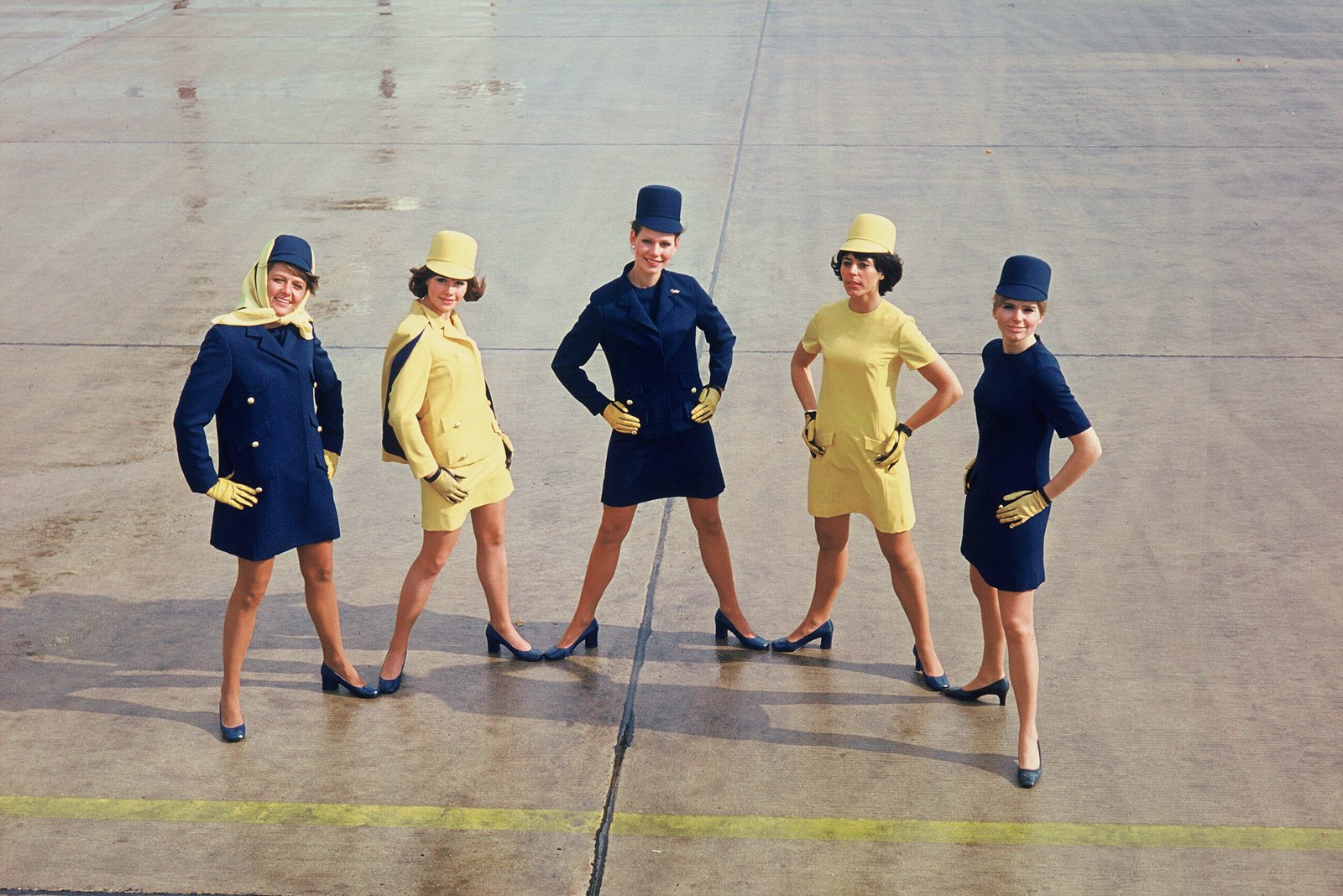 ベルリンのデザイナーが手掛けた1970年代のユニフォーム。流行のミニワンピで、帽子と手袋に至るまでルフトハンザカラーで統一。