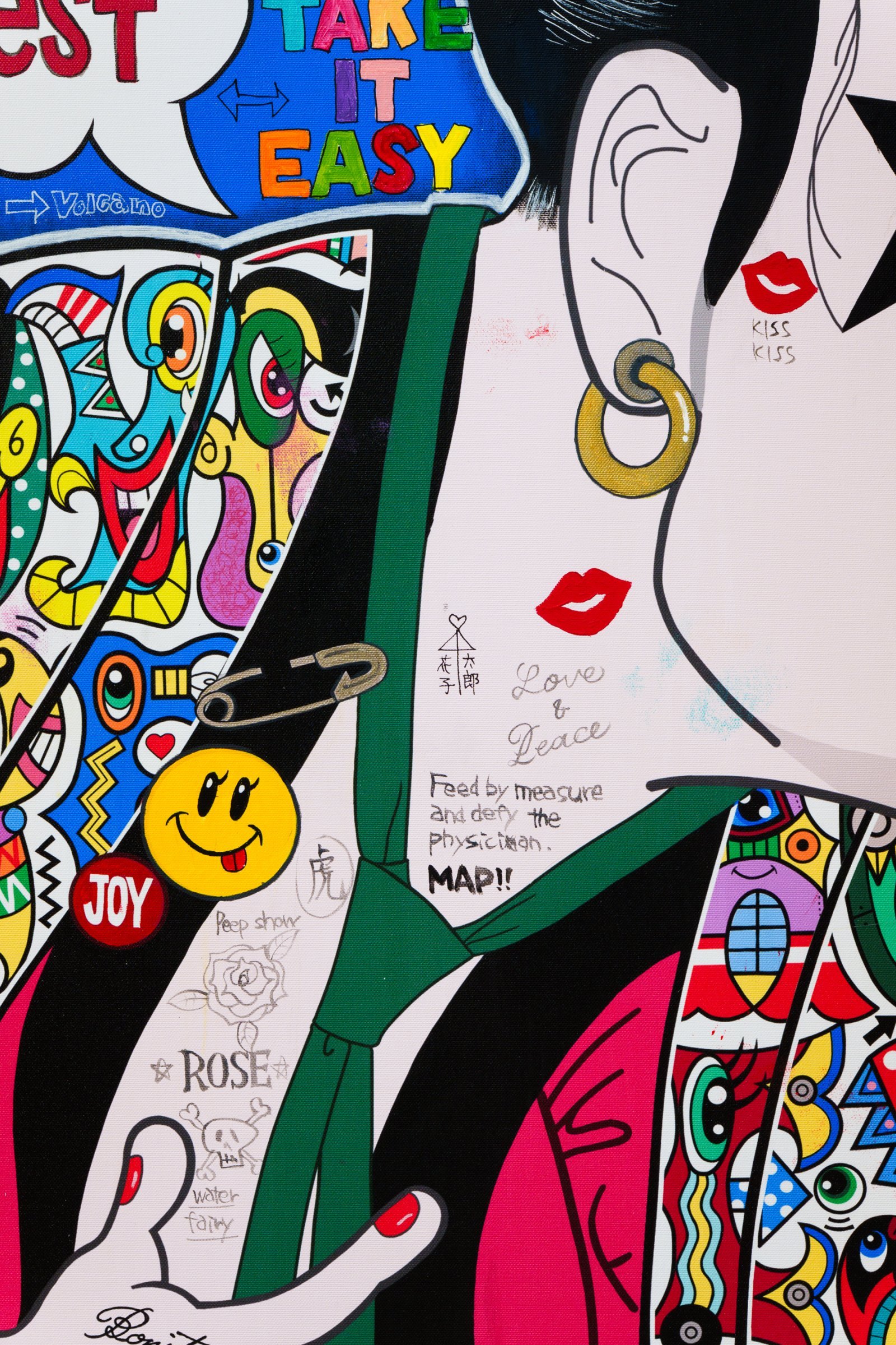 大枠のモチーフ以外にぎっしりと描きこまれたキャラ、図案、言葉は、そのときどきに思い浮かんだことが中心のようです。
