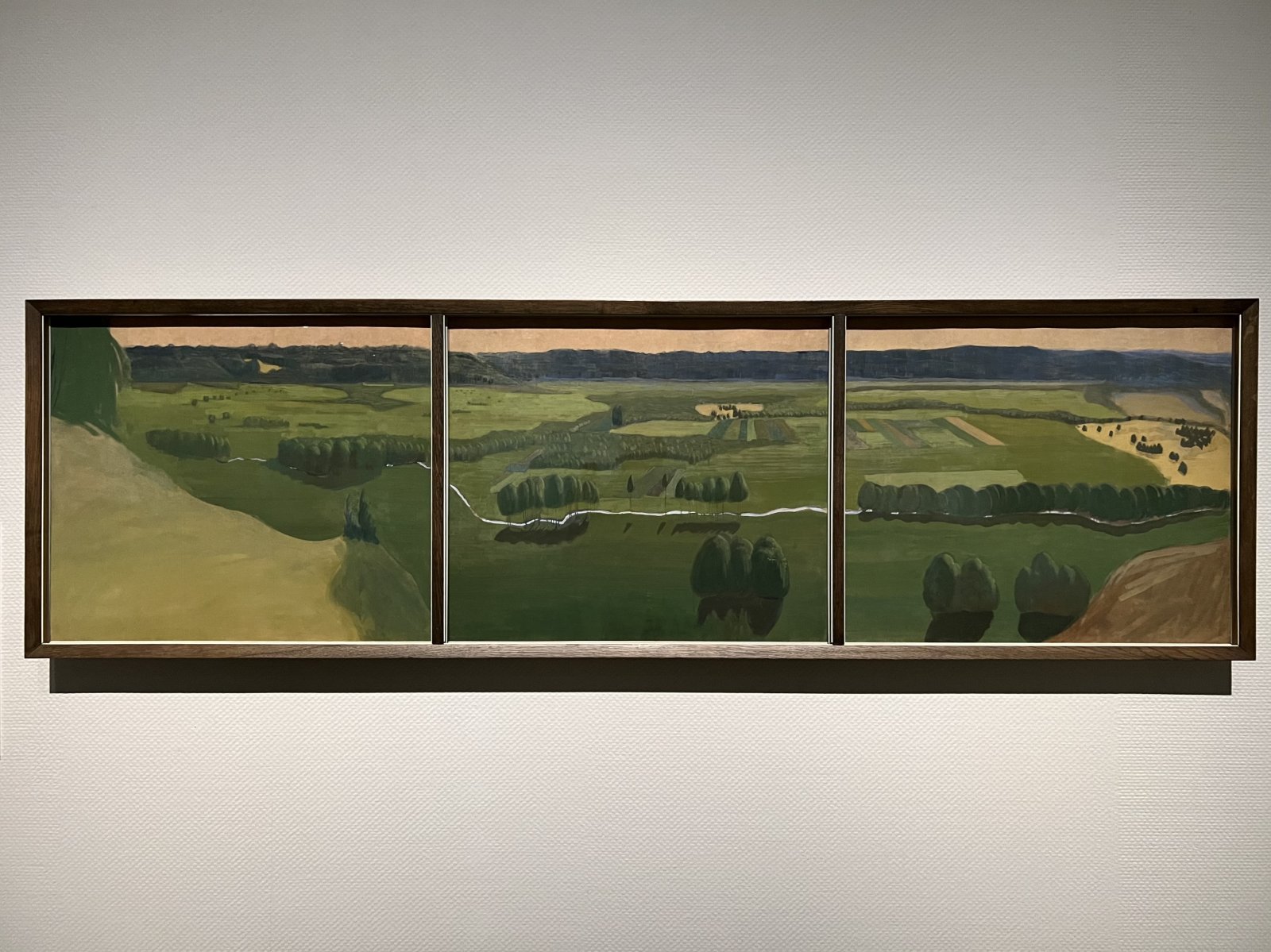 リトアニア北西部ジェマイティヤ地方の十字架を題材とした、『リトアニアの墓地』に注目したい。自然崇拝や祖霊信仰とキリスト教が融合して生まれたこれらの十字架は、リトアニアの文化を体現する存在。ロシアの同化政策のもとで制作が禁じられたが、人々のあいだでは独立への願いを託す「静かな抵抗」のしるしとして受け継がれていた。ここでは具体的な風景描写を離れ、リトアニアの大地に根差す記憶と祈りを凝縮した、精神的な風景として立ち現れている。