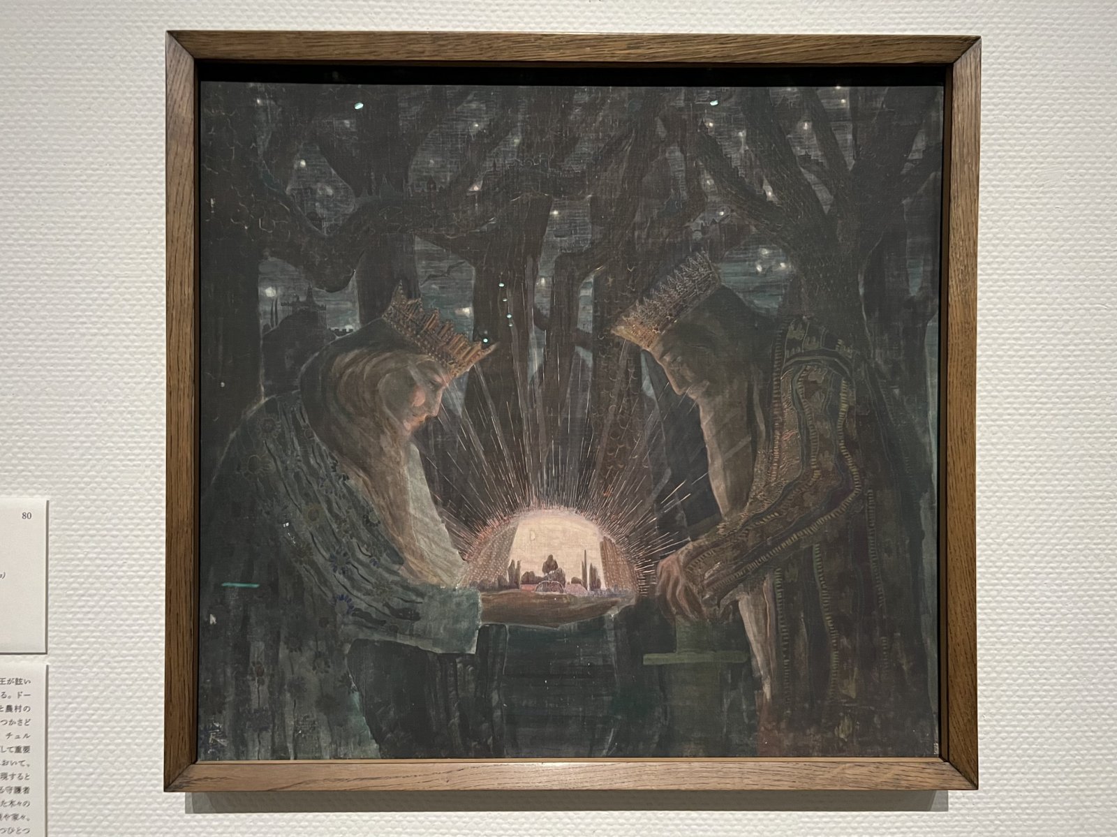 28歳のチュルリョーニスは、1904年、新設されたワルシャワ美術学校に入学する。初期の作品には象徴主義の影響が色濃く表れているが、多くが散逸したため、現存する作例は極めて貴重だ。そのうち『森の囁き』では、暗い森の奥にぼんやりと「手」の気配が浮かび、木々のフォルムが竪琴の弦を思わせる。ざわめく森と音色とが溶け合うような表現からは、彼の絵画に通底する音楽的感覚がおぼろげに感じられる。