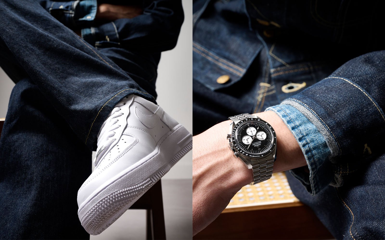 左:オメガ「スピードマスター ムーンウォッチ ブラック ホワイト」 右:ナイキ「ナイキ エア フォース 1 '07」