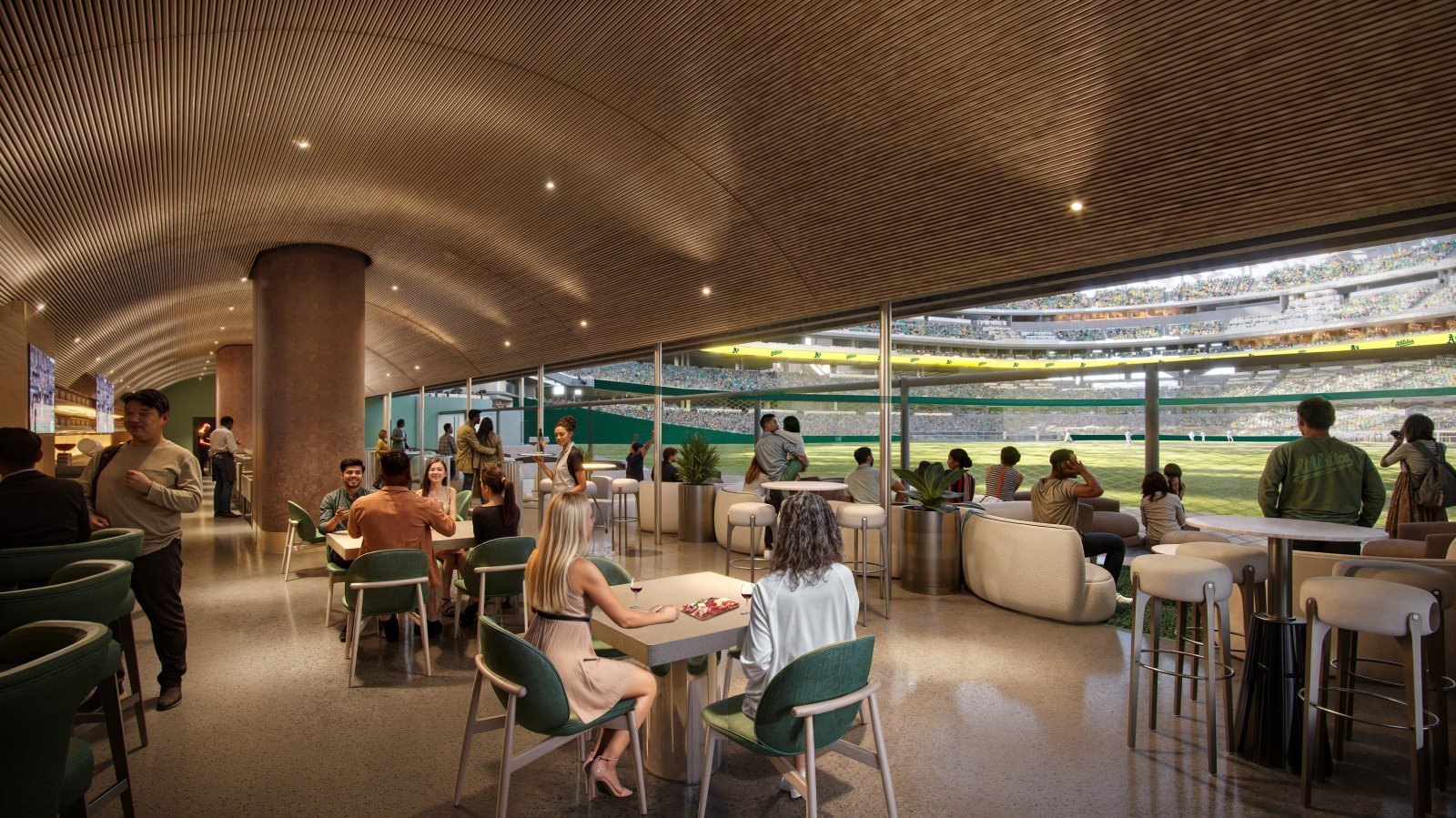 来場者は入場の瞬間から、その親密さを肌で体感する。幹線道路から高架になったプラザを経て、メインコンコースへと入場。ガラスのアトリウムを抜けると、フィールド全体が一気に視界に飛び込んでくる。グラウンド間近の客席でも快適に過ごせるよう、座席の足元から空調の冷気を送るなど、暑さ対策も施される。