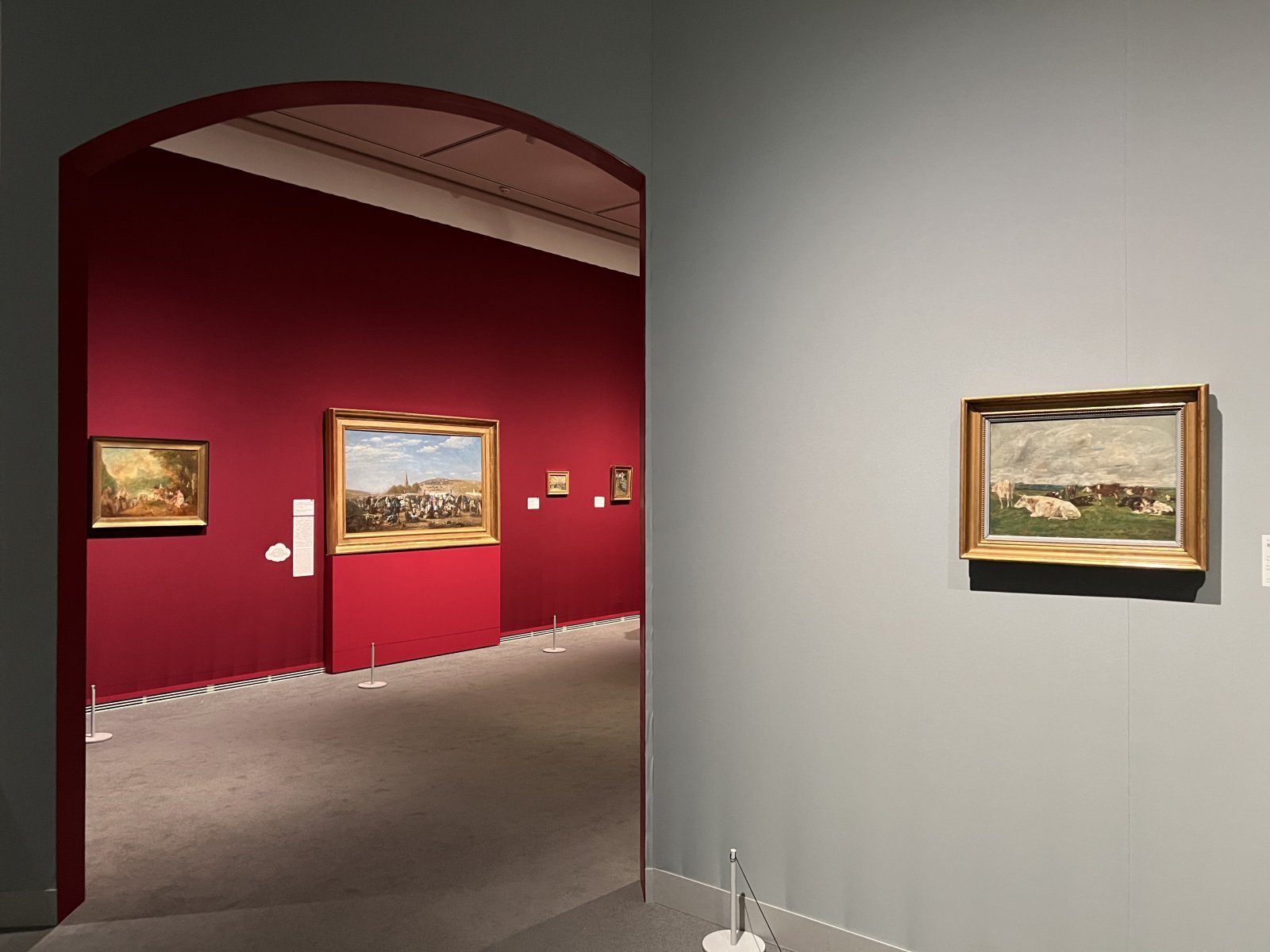 一方で牛を主題とした『海辺の牛』に目を向けたい。19世紀フランスでは家畜を描いた風景画が人気を集め、特に1880年代にはトロワイヨンの手がけた牛の絵が一世を風靡する。ブーダンもまた画商の求めに応じて牛を描くものの、ここではトロワイヨンの表現とは異なり、粗放な筆致と簡潔な色面が見てとれる。当時としては未完成とも受け止められかねないが、むしろ抽象性を帯びた描写こそ、「印象派の先駆者」たらしめるゆえんといえる。