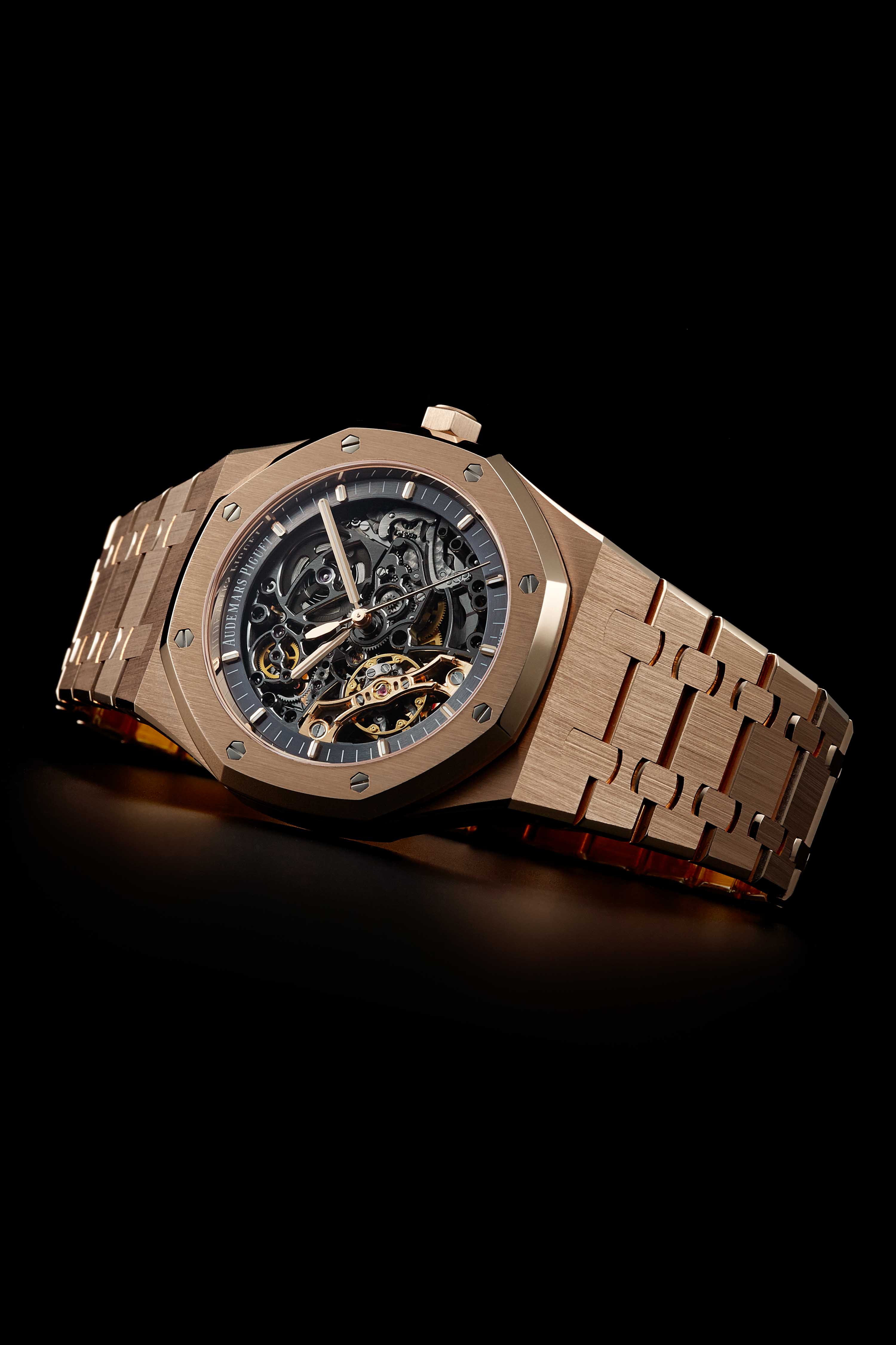 この「ダブル バランスホイール」は2010年に特許を取得した世界初の機構だが、これをダイヤルプレートのないスケルトンで前面に配置したのが「ロイヤル オーク・ダブル バランスホイール」だ。通常は裏側にあるテンプを主役のようにアレンジしており、特別設計のムーブメントであることがわかる。しかも、ブリッジなどが巧妙な曲線でデザインされているのだ。